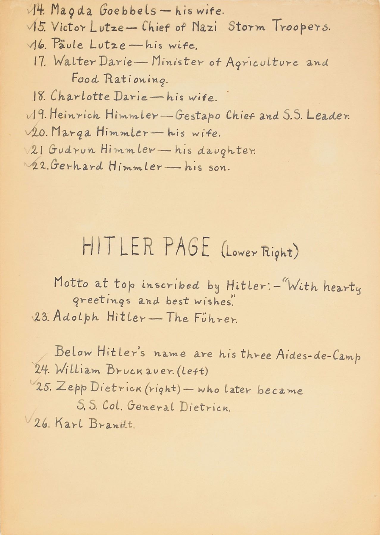 Major Charles W. Sudlow 'liberated' these guest book pages from the home of Reichsleiter Philipp Bouhler when his anti-aircraft artillery brigade requisitioned Bouhler's home in South Germany as a command post just before V-E Day. Bouhler was both a Reichsleiter and Chief of the Chancellery of the Fuhrer of the NSDAP, and he oversaw some of the greatest atrocities committed by the Nazi regime. After being arrested by American troops in May 1945, he committed suicide. These pages from his guest book offer a rare compilation of autographs from the leadership of the Nazi Party, along with their wives and children.
