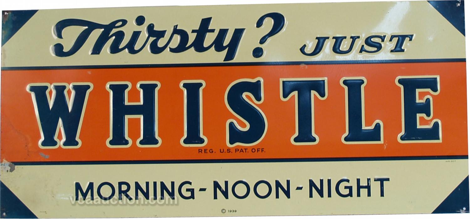 Thirsty Just Whistle Embossed Tin Sign "Morning - Noon - Night" c1939 - 27" x 12"