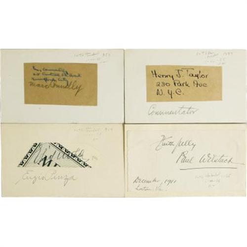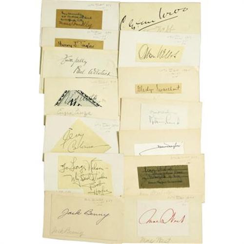 <B>Thirteen Autographs of Creative Americans.</B></I> This lot consists of mostly clipped signatures mounted to 5" x 3” cards and features, actors, writers, producers and musicians. Among the luminaries represented are Jack Benny, Jean Hersholt, Bob Hope, Henry Taylor, Clifton Webb, Orson Wells, Mae West. Many large, bold signatures. Overall fine condition.<I>From the collection of Henry E. Luhrs.</B></I><BR><BR><b>Shipping:</b> Flat Material, Small (<a target="_blank" href="http://www.heritageauctions.com/common/shipping.php">view shipping information</a>)