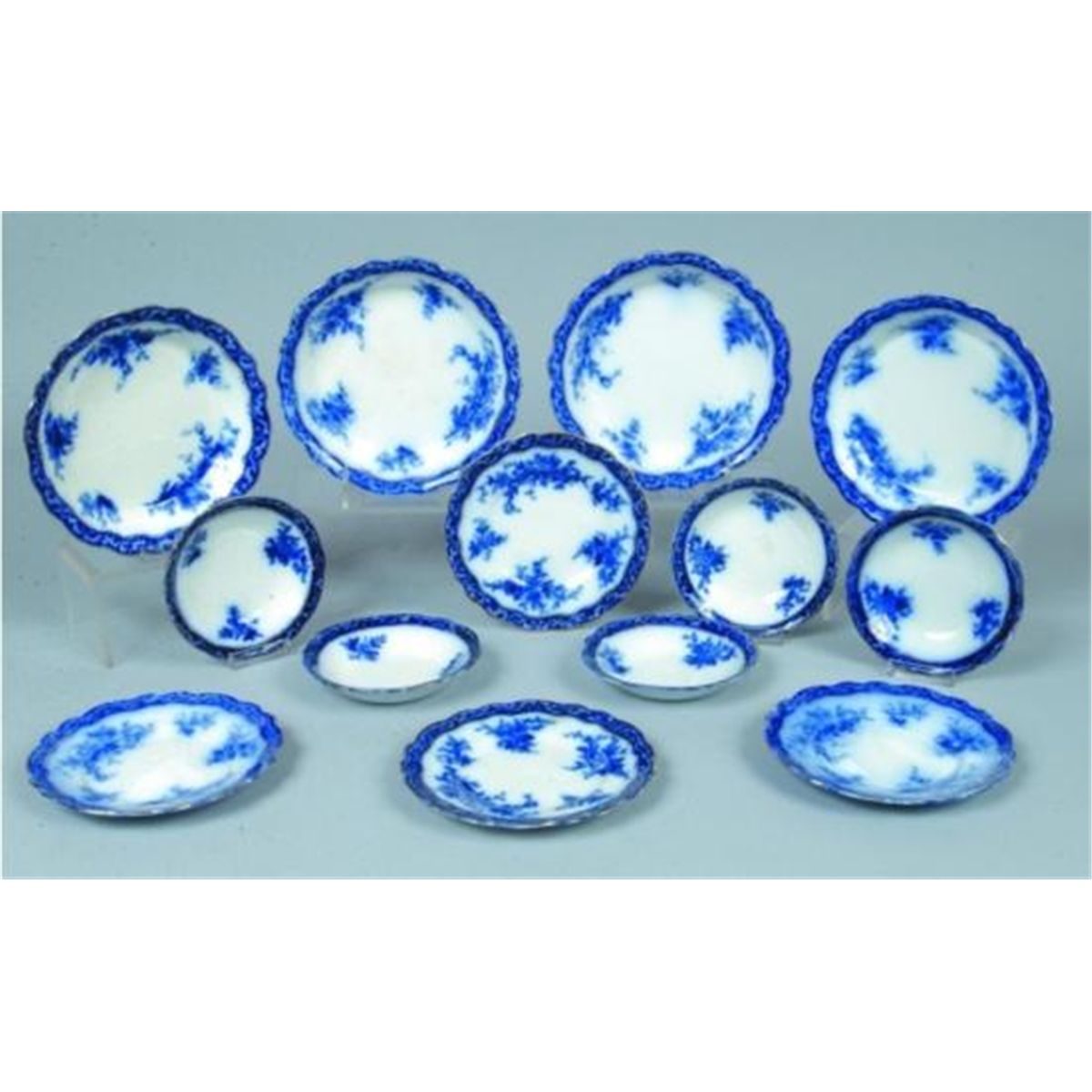 Thirteen Pieces Flow Blue Ironstone Tableware, Four service dishes 7 3/4ind., four B&B plates 6 1/2ind., five side dishes 5 1/4ind. Touraine design with gold accents. Marked: Stanley and Henry Alcock Pottery Co.