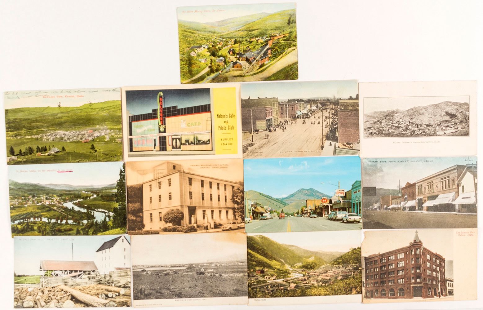Includes: Payette saw mill, Payette street scene, a Council bird's eye, Kamiah bird's eye, DeLamar bird's eye, Silver City bird's eye, Wallace hotel, Salmon main street, St Maries river scene, Ketchum street scene, Orofino post office, Burley Pilot's Club. Date: Location: Idaho HWAC # 54542