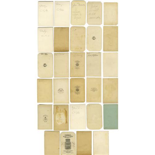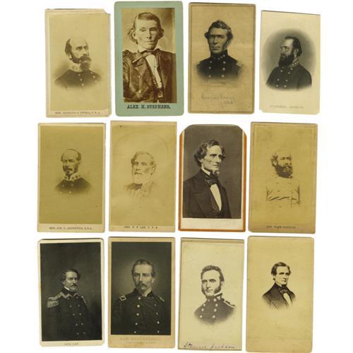 <B>Dealers Lot of Thirty Confederate States Related <I>Cartes de Visite</B></I>.</B></I> Seven "from life" photographs and twenty-three engravings make up this fine lot of Confederate related subjects. Included are: Jefferson Davis, Joseph Johnston, Wade Hampton, Alexander Stephens, P.G.T. Beauregard, Stonewall Jackson, Robert E. Lee, Richard Ewell, John Mason, John Slidell, Robert Toombs, John B. Floyd, Braxton Bragg, Louis Wigfall, James Longstreet, Felix Zollicoffer, and William Simms. A fantastic grouping of military and political figures! All in fine or better condition; most exhibit moderate to light soiling and toning on both sides; pencil notations on several; some missing corners.<BR><BR><b>Shipping:</b> Small Flat (<a target="_blank" href="http://www.heritageauctions.com/common/shipping.php">view shipping information</a>)