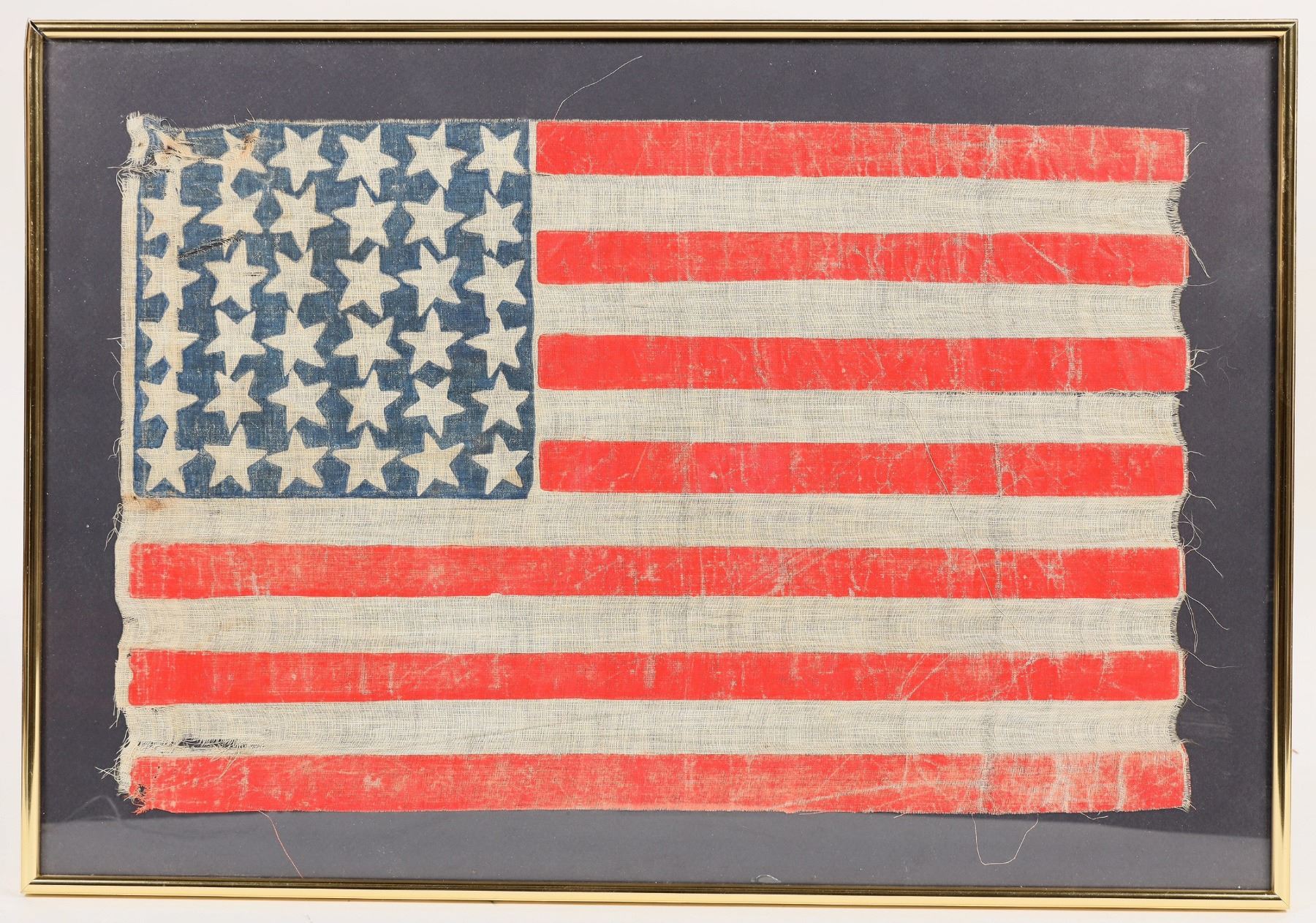 This American Flag wears 36 stars on printed gauze or muslin fabric at 12 in. X 18 in. The 36 star flag is one of the rarest of American flags because it only flew for twenty-eight months. It is sometimes referred to as the "reconstruction flag" which is not entirely accurate. Important to Nevada as the 36th state, the flag was not issued nationally until July 4, 1865; however, it was flown over Union troops before the Surrender at the Appomattox Court House in April of 1865. Nevada having been admitted to the Union on October 31, 1864. This flag was likely flown at a parade without mounting grommets. It was secured by three nails or staples to a dowel or stick evidenced by oxide on the fabric at three locations. This flag shows wear at the outer edges from limited use. The 36 star flag represents the unification of the nation after the Civil War. Nevada, take it home. Please see photo for details.