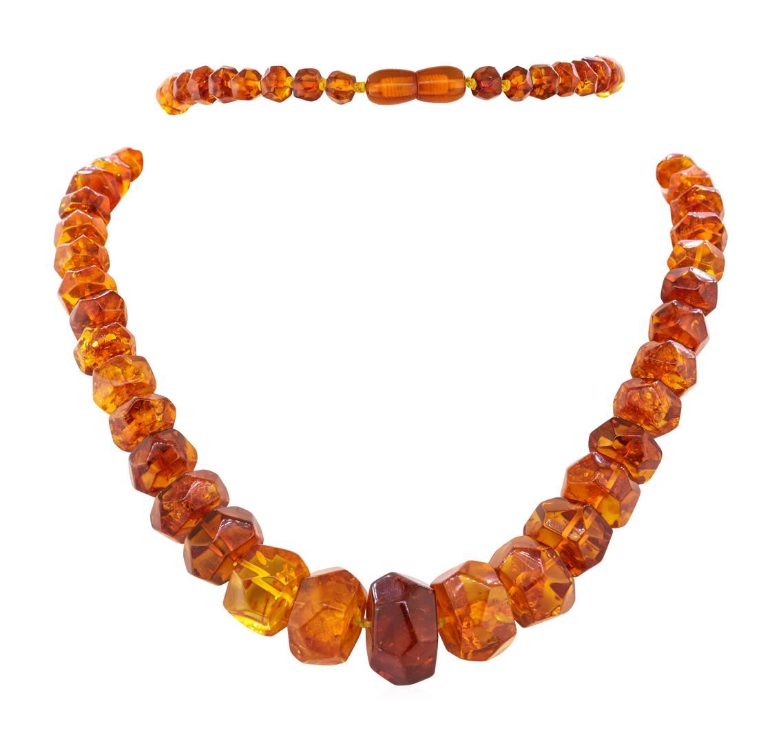 One vintage necklace measuring approximately thirty three and a half inches in length with a threaded, screw-on clasp featuring: faceted beads of Baltic amber measuring from 25.5mm to 7.5mm in diameter, with a total weight 82.35 grams.