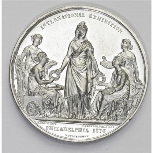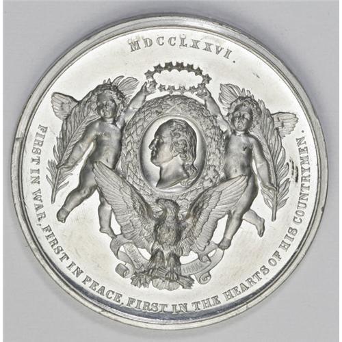 <B>Group Lot.</B></I> Consists of: <B>1876 International Exhibition Philadelphia Washington Medal,</B></I> Uncirculated and prooflike, Baker 426B, beautiful medal portraying George Washington on the obverse with winged angels on each side holding a crown of stars above his head, around the edge are FIRST IN WAR, FIRST IN PEACE, FIRST IN THE HEARTS OF HIS COUNTRYMEN, on the reverse there are gowned figures receiving laurels, representing Agriculture, Arts, Manufacturing, and Science, struck in very high relief with a high strong rim; and a <B>1889 Washington Centennial Anniversary Medal,</B></I> Uncirculated prooflike, Douglas 48, 50.5 mm, white metal, R.7, nice, obverse Harzfeld bust of George Washington in oval surrounded by oak and laurel, reverse is oath-taking scene of Jefferson and Livingston with Washington. Viewing is recommended.