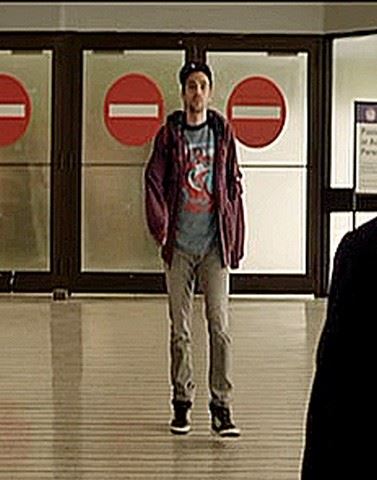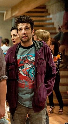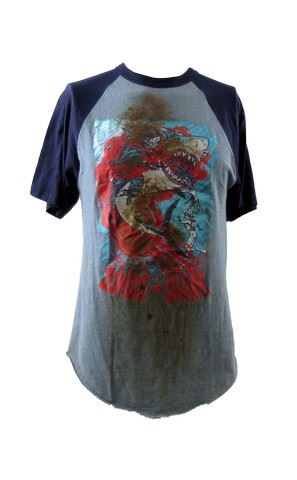 This Is The End Jay Baruchel Screen Worn Costume - In the insane and talented minds of writer-director's Seth Rogen and Evan Goldberg, all Jay Baruchel expected coming to LA was a fun time with his best friend Seth Rogen (yes, everyone plays themselves in the movie!), at a wild housewarming party for fellow actor James Franco. What he, and all the others didn't expect was that this may be their last night on Earth, and they'd have to somehow band together to try and save themselves! This is Jay's hero screen used costume seen throughout the film. It includes his iconic Triple F.A.T. Goose purple hoodie cotton jacket with the "Triple F.A.T. Goose" embroidered patch on the right front, and an embroidered Triple F.A.T. Goose logo on the left; his unique Augusta T-Shirt with the "Zombie Shark" full color silk-screened design on the front; his gray Levi 511 100% cotton jeans and his ankle length three-stripe Adidas sneakers. The Triple F.A.T. Hoodie and T-Shirt have been aged with dirt and other stains from the various action sequence, Including hanging on the edge of a massive pit "into hell" caused by an earthquake (and sending actors Cera, Mintz-Plasse, Rihanna, Mindy Kaling, Aziz Ansari, Kevin Hart, Jason Segel, and David Krumholtz to their untimely deaths!). Comes with an official Certificate of Authenticity from Sony Pictures, including their hologram-style seal. Hoodie jacket is Size L, Zombie-Shark T-Shirt is Size M, Levi's are size 32x34 and the Adidas are size 12.