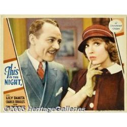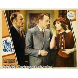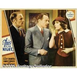 <B>This Is The Night (Paramount, 1932).</B></I> Lobby Cards (3) (11" X 14"). French actress Lili Damita stars in this screwball comedy as a woman desired by two men, Roland Young and Cary Grant. Although the beautiful Damita starred in several early sound films, she was more well known for the men she married. Her first short-lived marriage was to famed director Michael Curtiz (1925 - 1926). She gained most of her notoriety however, during her tumultuous romance and marriage to swashbuckler Errol Flynn (1935 - 1942). Offered in this lot is three lobby cards, each features a terrific image of the lovely Damita, and one card also features a stunning shot of a young Cary Grant, who was appearing in his feature film debut. There are pinholes in the top center of all three cards, pinholes on the bottom center of the card featuring Damita and Young, and a paper clip mark on the top of the card featuring Damita, Young and Charlie Ruggles. These minor defects do not distract and all the cards displays very well. 3 items