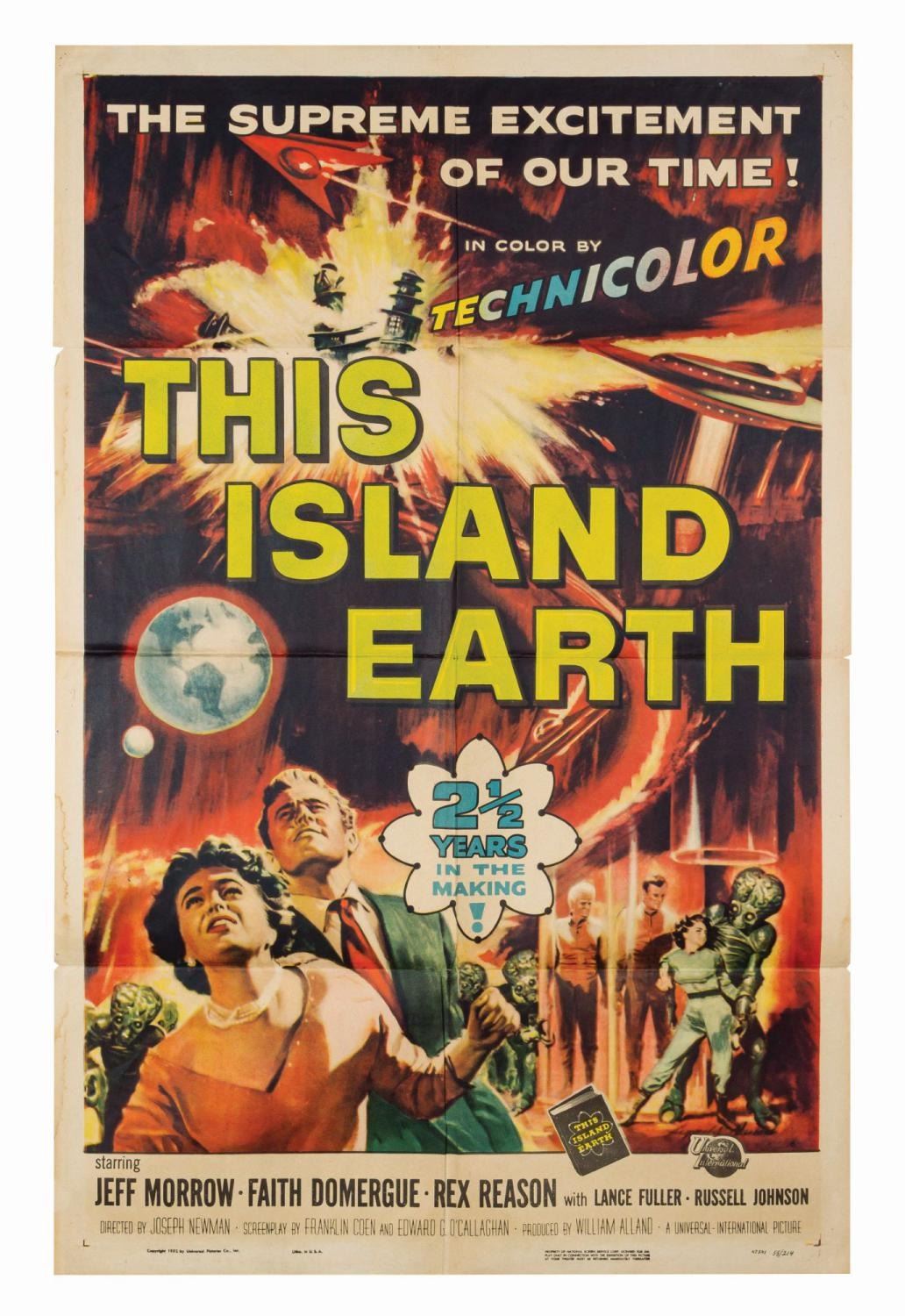 (Universal, 1955) An original U.S. 1-sheet poster for This Island Earth. A perennial genre-fan favorite, the film was priased for its special effects and story, and would later enjoy even greater interest after it was featured as the experiment in Mystery Science Theater 3000: The Movie. Folded as issued, the poster measures 41"x27" and is in good condition with moisture staining along the left edge, staple holes at the edges, small tears and chips, and some cellotape applied to the reverse for reinforcement.