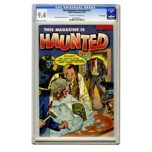 <B>This Magazine Is Haunted #13 Crowley Copy pedigree (Fawcett, 1953) CGC NM 9.4 Off-white to white pages.</B></I> Here's a heads-up for you: a severed head cover (and story) is the featured attraction in this issue! The book's team of artists is "headed" by Sheldon Moldoff, who drew the cover in addition to contributing interior art. And this copy "heads" CGC's census as the only 9.4 to be certified as of this writing. In fact, we'll "stick our neck out" and say it's the best existing specimen. Overstreet 2005 NM- 9.2 value = $440. CGC census 12/05: 1 in 9.4, none higher.