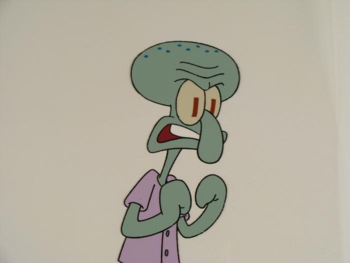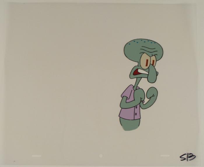 This original animation cel is from the Nickelodeon TV show SpongeBob Squarepants. The story takes place under the deep blue sea in Bikini Bottom, where SpongeBob resides. SpongeBob, who is a yellow, porous sponge, is your typical happy-go-lucky character, as he is always cheerful and enjoys making people laugh. Patrick Star, SpongeBob's neighbor who is a starfish, is your average children's show idiot, as he boasts knowing nothing and is often getting himself into ridiculous situations. Between the homes of these two lies the home of the miserable Squidward, a squid, who is known for being grouchy and playing tricks on SpongeBob and Patrick. Both SpongeBob and Squidward work at the Krusty Krab, a fast food business run by the greedy money-loving Mr. Krabs, a crab, the arch rival of the evil, possibly misunderstood, Plankton. Another neighbor, Sandy Cheeks, an athletic squirrel who normally wears an astronaut's space suit, was introduced in "Tea at the Treedome." She spends most of her time inventing and experimenting. WARNING! This fight might become too graphic for some of our viewers. Any small children that might be in the room, should leave now...Original Production Animated Cel Overall Size of Cel: 10 1/2" x 12 1/2" Excellent ConditionThis is an original hand-painted cel set-up used in the production of an episode of "SpongeBob SquarePants." Each one-of-a-kind set-up represents a slight change in position of the characters. When individually photographed and projected in rapid succession, the images appear to move.