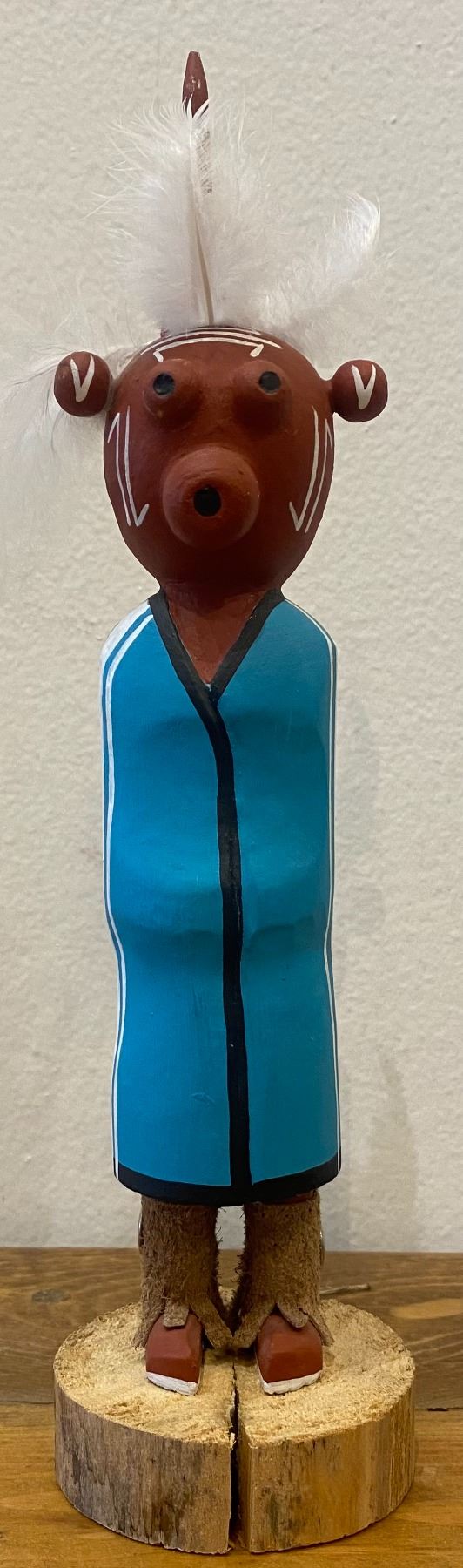 A Mudhead Kachina measuring 9.5 by 2.5-inches created by D. Livingston. Also has -95- (1995??).