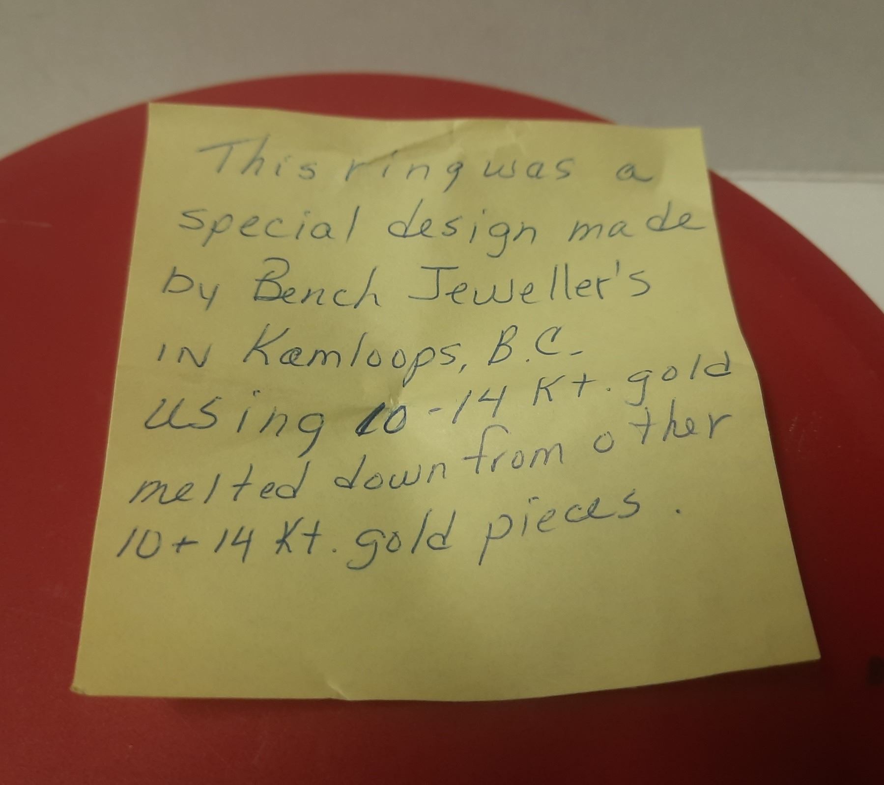 This Ring was a special design made by bench Jeweller's in Kamloops, B.C. using 10-14KT gold melted down from other 10-14KT gold pieces. Size - 9, Weight - 9.7g. (Note: Can't Proof Authenticity description as per consignor information)