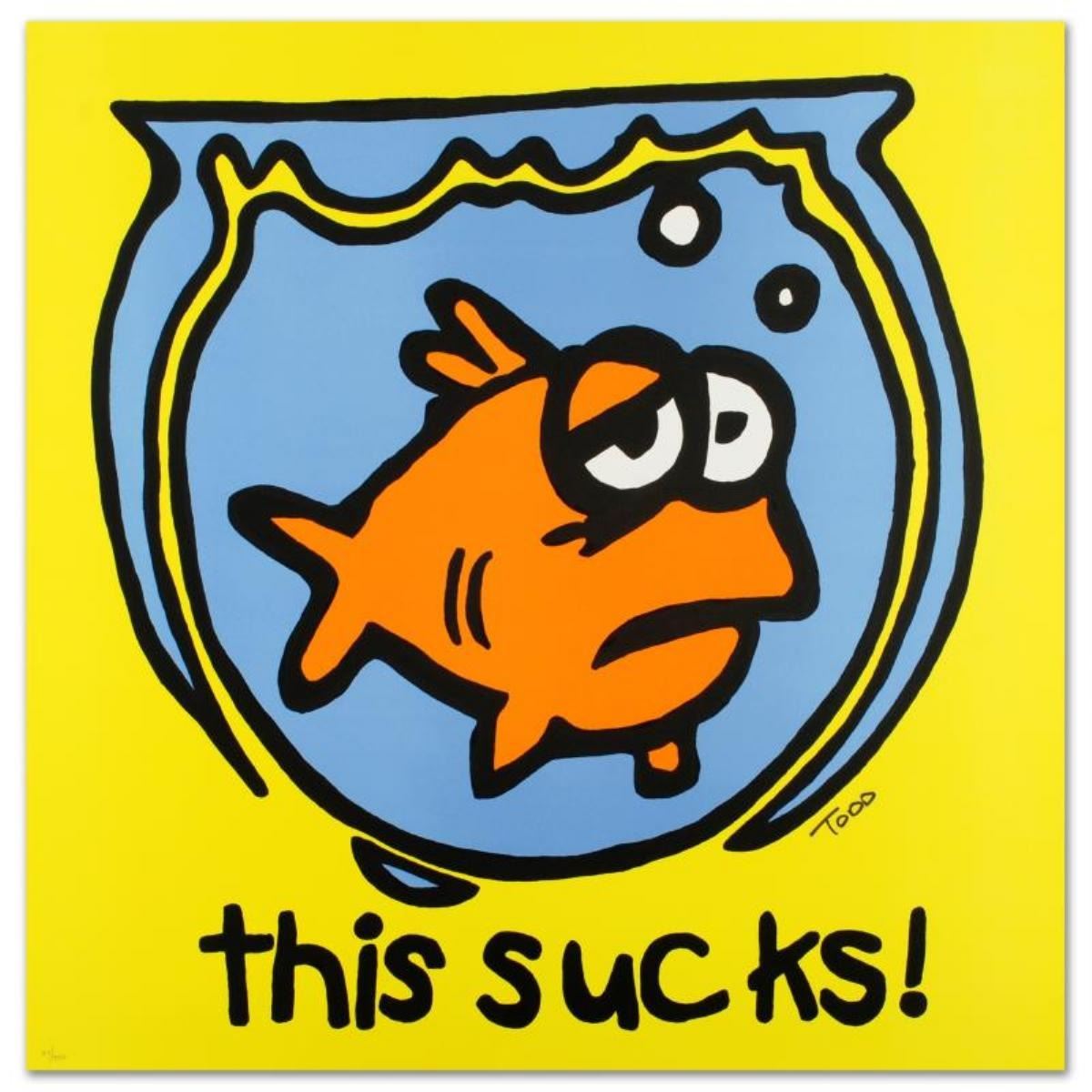 This Sucks! by Goldman, Todd. Pop artist Todd Goldman is known all across the globe for his whip-smart and wickedly funny puns and pictures! "This Sucks!" is a limited edition lithograph on paper, numbered and hand signed by Todd. Includes Certificate of Authenticity! Measures approx. 28" x 28" (no border).