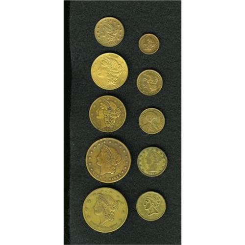 <B>Group Lot.</B></I> Consists of: <B>Five Scarce Game Counters from the 1850s-1860s,</B></I> (ca. 1860) Washington-In Unitate Fortitudo, STRENGTH IN UNITY gaming token, Baker-607, AU, one of a group of game counters produced by Ludwig Christian Lauer in Nuremburg, Germany, in the mid-1860s, the image of Washington is based on an 1817 print by Giuseppe Longhi; 1849 California Counter Gambling Token, five dollars with miner, brass, VF, used in the old gambling halls and saloons of the West; 1855 Half Eagle California Counter, AU, gold-plated copper, rare, the obverse resembles a federal half eagle, the reverse has an eagle perched atop a globe with OUR COUNTRY; (ca. 1850s) Double Eagle Size Spielmarke, AU, made by Lauer, listed in Rulau and Fuld's <I>American Game Counters</B></I>; and <B>Five Liberty Head Game Counters from the 1850s,</B></I> Gold Dollar Size Spielmarke, AU, made by Lauer, listed in Rulau and Fuld's <I>American Counters</B></I>; Quarter Eagle Gaming Counter, Theodore Bollenhagen & Co., AU, the reverse depicts a popular view of New York City Hall, the token was engraved and made in Germany for Bollenhagen; Eagle Gaming Counter, Theodore Bollenhagen & Co., AU, the reverse depicts a popular view of New York City Hall, the token was engraved and made in Germany for Bollenhagen; Double Eagle Sized Spielmarke, AU, made by Lauer, listed in Rulau and Fuld's <I>American Game Counters.</B></I><BR><BR><b>Shipping:</b> Coin/Currency (<a target="_blank" href="http://www.heritageauctions.com/common/shipping.php">view shipping information</a>)