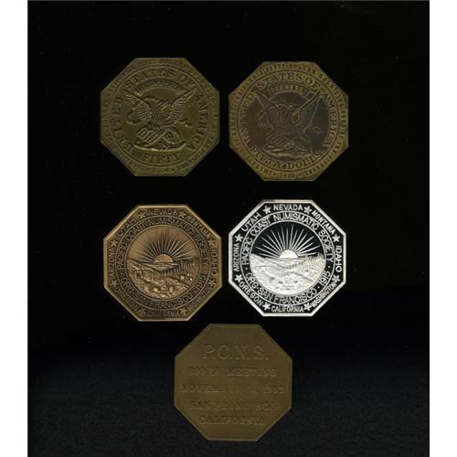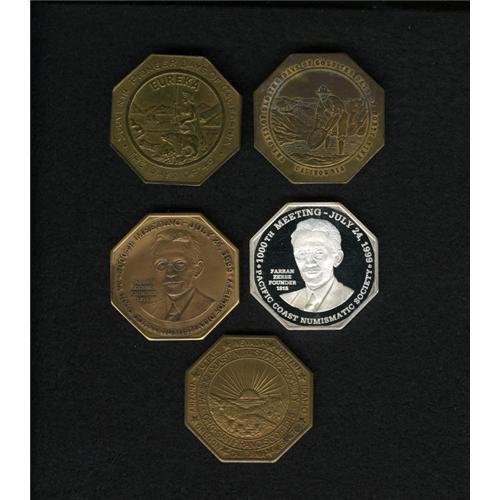 <B>Group Lot of Medals.</B></I> Consists of: <B>Two California $50 Slugs,</B></I> facsimile from the 1940s, the miner standing in the creek and DAYS OF 49, Eureka type, these are scarce and very actively sought after; and <B>Group of Three PCNS Souvenir Slugs,</B></I> scarce octagonal slugs issued by Pacific Coast Numismatic Society, 800th meeting's bronze slug with mintage of 200 and 1,000th meeting's slugs in bronze and proof silver.