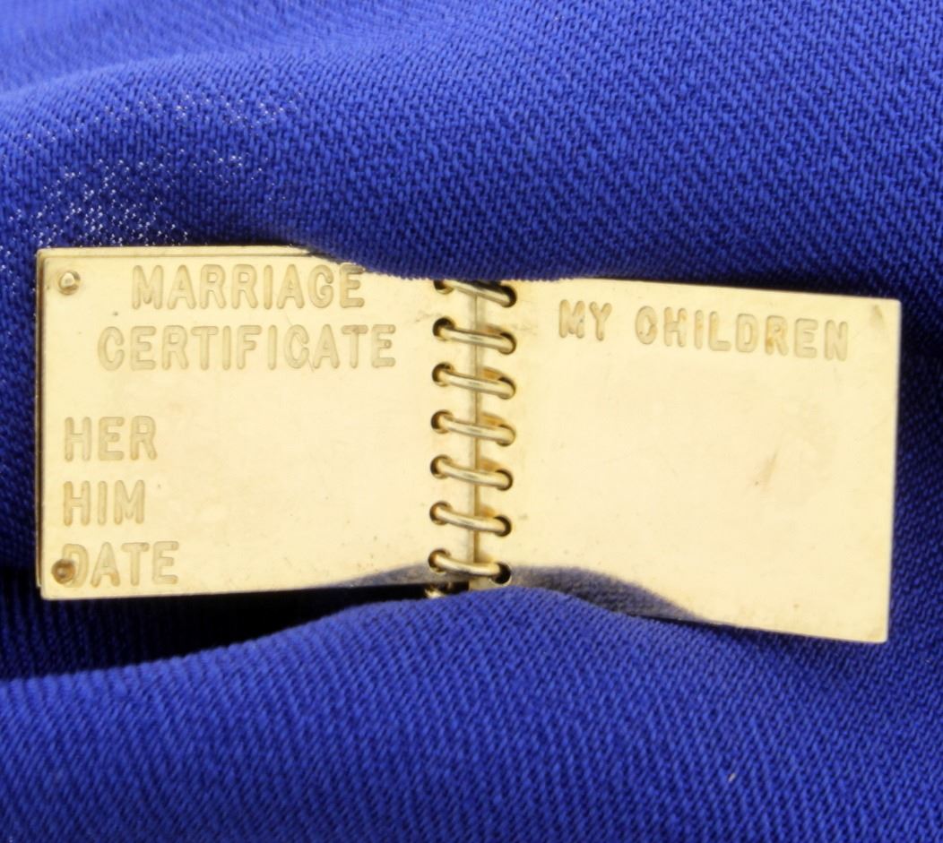 The book is 14K yellow gold. It has a page for Special Events, Places I've Been, Marriage Certificate, and My Children. It is 7/8 inch long. 4.7g