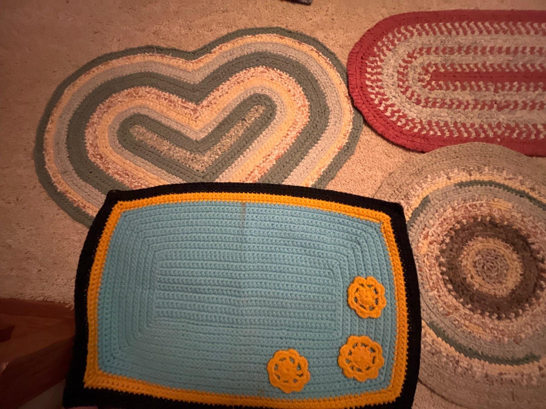 This is a handmade collection of crocheted rag rugs