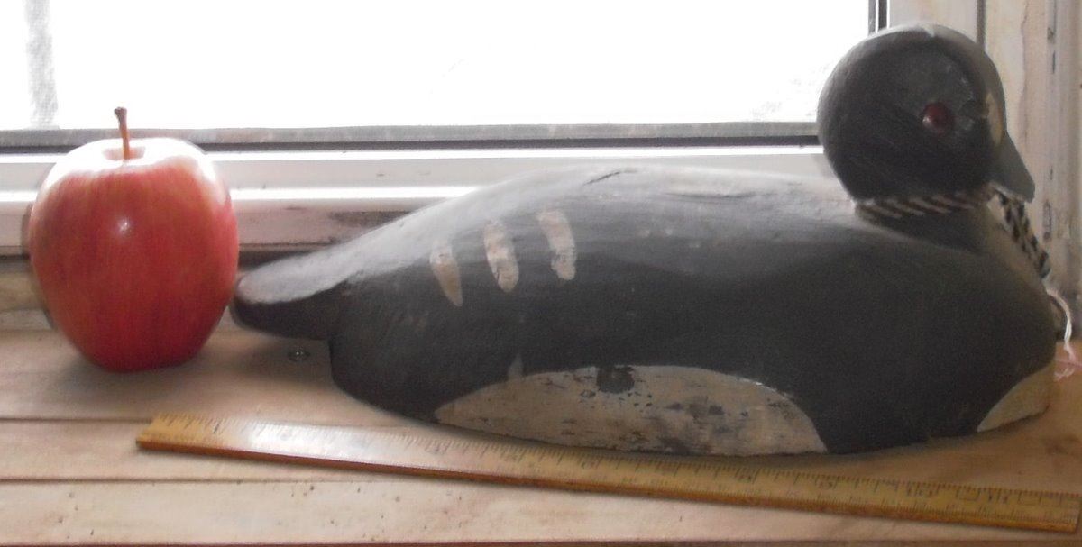 As is it was many years ago part taken off under beak, this hand sculptured by Joachin (Joachim) Burcheron Lariviere is an original wood duck decoy over or near 100 years old and still captures attention; it's about 6 high x 12 inches long x nearly 6 wide; and is worthy, valuable; which is now antique with such original paints and with great patina; the artist who travelled in California and Quebec and Ontario where he died in Canada many years ago, his works of art and decoys have sold over $6,000.00 US ! Collectors seeks and keep Joachin Burcheron Lariviere original wood duck decoys and other sculptures such as a moose as well as his paintings of forests, lakes, rivers... and they treasure them in their collections and rarely are they offered to be appreciated again on the markets; AOAV represents now the estate and the AOAV-musee decommission these now to offer them for sale in this extraordinary attic-find treasure for you to enjoy !