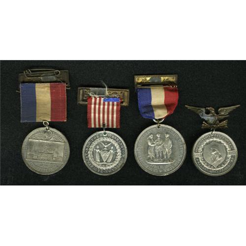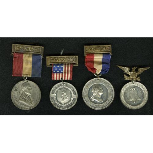 <B>Group Lot of Medals.</B></I> Consists of: <B>1787-1887 Centennial of U.S. Constitution Medal,</B></I> reverse is Liberty Bell, comes with metal eagle attached, Choice AU, prooflike; <B>1787-1887 Centennial of U.S. Constitution Medal,</B></I> reverse is Independence Hall, comes with ribbon and medal, AU; <B>1789-1889 Washington Inauguration Centennial Medal,</B></I> Douglas 49A, commemorating the oath of George Washington, comes with ribbon and medal, AU, prooflike; and an <B>1889 Washington Inauguration Medal,</B></I> Douglas 49A, commemorating the oath of George Washington, comes with ribbon and medal, AU, prooflike.