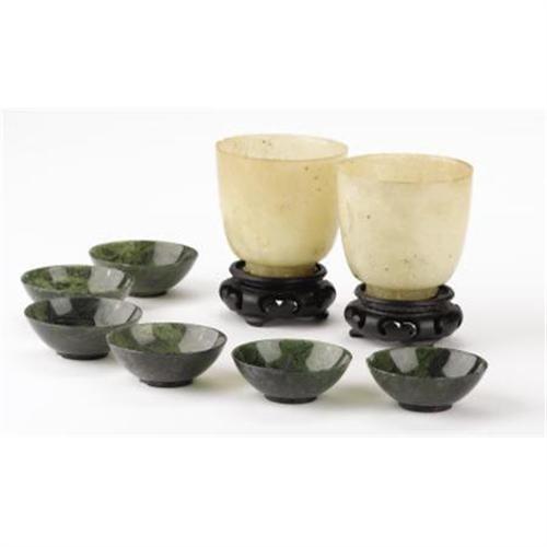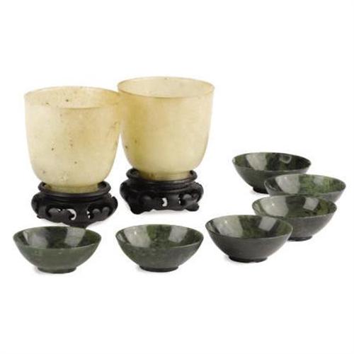 <B>Eight Chinese Hardstone Objects<BR></B></I>Unknown maker<BR>Twentieth Century<BR>Group of eight Chinese carved hardstone objects including: a pair of white mallet-formed footed cups; together with six spinach green jade shallow bowls.<BR>Unmarked <BR>2.75 inches (tallest)<BR> <BR>Provenance:<BR>Fowler Museum, Los Angeles, CA<BR><BR><BR><b>Shipping:</b> Requires 3rd Party Shipping (<a target="_blank" href="http://www.heritageauctions.com/common/shipping.php">view shipping information</a>)