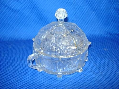 Pressed Glass Thistle Pattern Covered Candy Dish, measures 5 1/4" d.