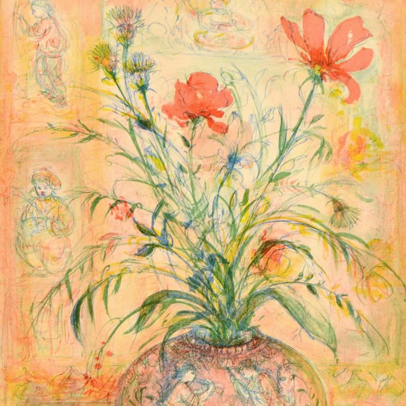 "Thistle Rose and a Day Lily" is a limited edition lithograph on paper by Edna Hibel (1917-2014), numbered and hand signed by the artist. Includes Certificate of Authenticity. Measures approx. 19.5" x 25.5" (border), 15.5" x 21.5" (image).