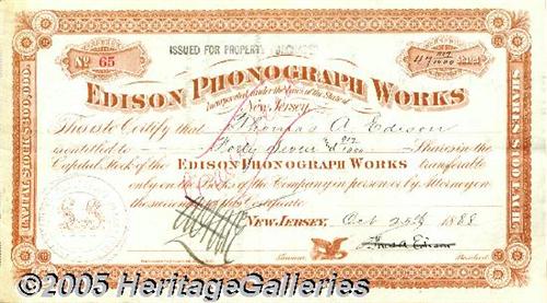 <B>Thomas A. Edison Phonograph Works Autographed Stock</B></I>Thomas Alva Edison (1847-1931), inventor. In his early years, he was slow in school. In 1879 he made commercially practicable the incandescent lamp. Other inventions included the kinetoscope, ore-mill machinery, the storage battery, and dictating machine. He invented the phonograph, his greatest single achievement from the viewpoint of inventive imagination. In 1888, he founded the "Edison Phonograph Works". Stock dated 1888 signed at front with ink cancellation line, issued to Edison and beautifully signed at back. Includes a modern series of 8 great Edison portraits taken from all periods of his life. Biographical information is included. Rare! Exceptionally nice example! A true classic that would be very special framed with a couple of portraits. <I>Accompanied by COA from PSA/DNA.</B></I>