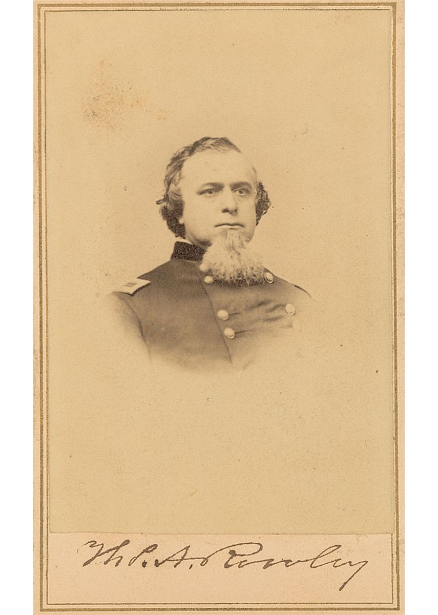 Union general who participated at Gettysburg and was wounded at Fair Oaks (1808–1892). Original 2.25 x 4 carte-de-visite portrait of Rowley in uniform by Trask & Davis of Portland, Maine, signed in the lower border in black ink, “Ths. A. Rowley.” In fine condition, with some light soiling, and numerous pencil notations to reverse.