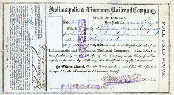 1876, Indiana. Stock certificate for 47 shares signed as president by THOMAS A. SCOTT, (1823-1881). Railroad executive. In August 1861, based on his previous railroad experience, Scott was appointed assistant secretary of war with responsibility for supervising all government railways and transportation lines, and brought with him in this position his personal secretary, Andrew Carnegie. In mid-1862, Scott left this position to begin an extended and brilliant career with the Pennsylvania Railroad, becoming president of that line in June 1874. Scott was president of numerous other railroads during his career as well, among them the Union Pacific 1871-72, and the Texas & Pacific (1872-80). Scott is well known for his attempt at monopolizing the transportation of the oil regions via the South Improvement Company. This was essentially a battle against John D. Rockefeller and the Standard Oil Company interests which sparked a bitter struggle resulting in victory for the vast oil empire. Failing to defeat Rockefeller at his own game, Scott liquidated the company in the spring of 1872. Stamp cancelled over signature. Fine.