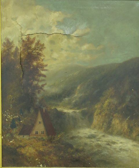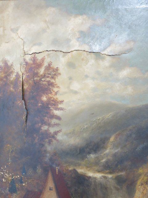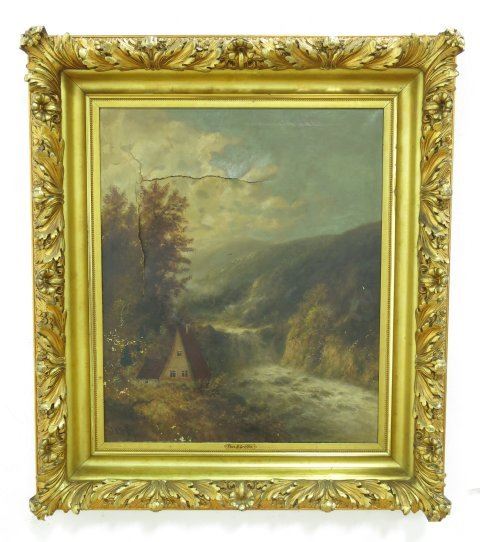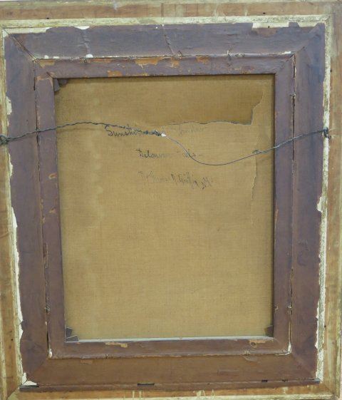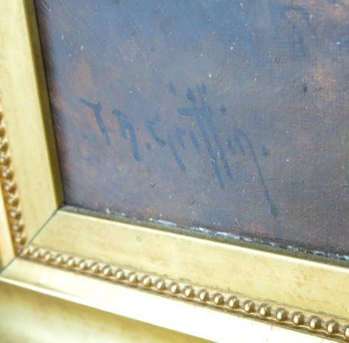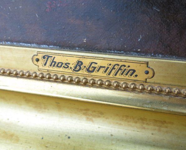 In gilded frame. Signed lower left and en verso "Sunshine and Shadow." Thomas B. Griffin, American (1858-1918). Approx. 30" H x 25" W image, 41 1/2" H x 36 1/2" W framed. 2 rips in canvas.