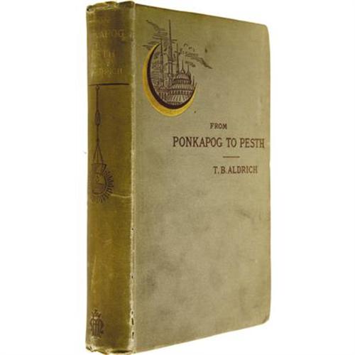 <B>Thomas Bailey Aldrich Signed: </B></I><B><I>From Ponkapog to Pesth</B></I></B></I><B> From the Library of Writer Eugene Field</B></I>. (Boston: Houghton, Mifflin and Company, 1883), first edition, 267 pages, signed by the author on the title page, grey pictorial cloth with maroon titles on the front board, gilt titles on the spine, 12mo (5” x 7.25”), soiling to boards, spine and corners frayed, corners bumped, a few small holes along the front hinge, rear internal hinge cracked, contents toned, else a good copy. As noted, this book is from the personal library of American writer Eugene Field. Field has signed his name on the ffep, and his son, Eugene Field II, has inscribed the book on the rear free endpaper “<I>This book came from the library of my father, Eugene Field. Eugene Field II Sept. 2-1823</B></I>”. A similar inscription on letterhead with Eugene Field’s coat-of-arms has been laid at the front of the book.<BR><BR><b>Shipping:</b> Books & Catalogs (<a target="_blank" href="http://www.heritageauctions.com/common/shipping.php">view shipping information</a>)