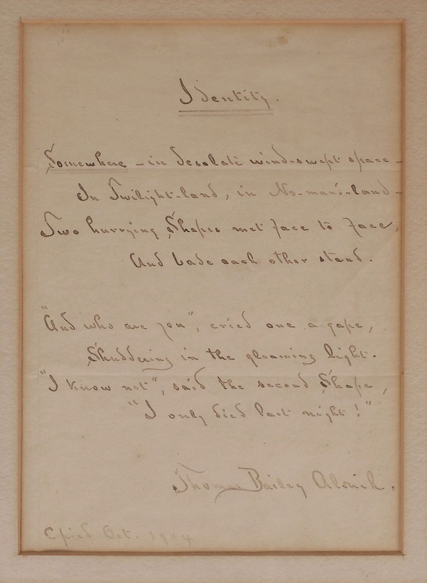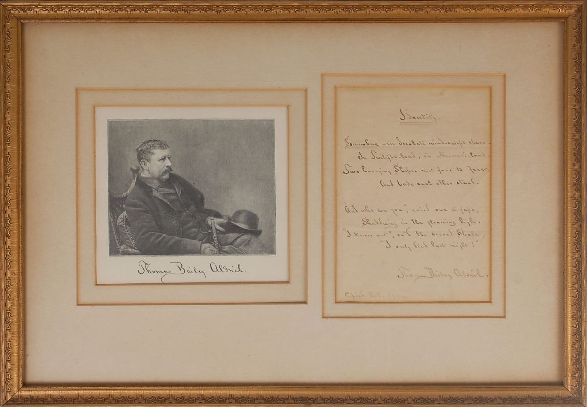 American poet and editor (1836–1907). Autograph poem signed “Thomas Bailey Aldrich,” one page, 5.25 x 7.5, October 1904. Aldrich pens his poem entitled “Identity.” In part: “Somewhere—in desolate wind-swept space— / In Twilight-land, in No-man’s-land— / Two hurrying Shapes met face to face, / And bade each other stand.” Double-matted and framed with an unsigned engraved portrait bearing a facsimile signature to an overall size of 20 x 14. In fine condition, with overall toning.