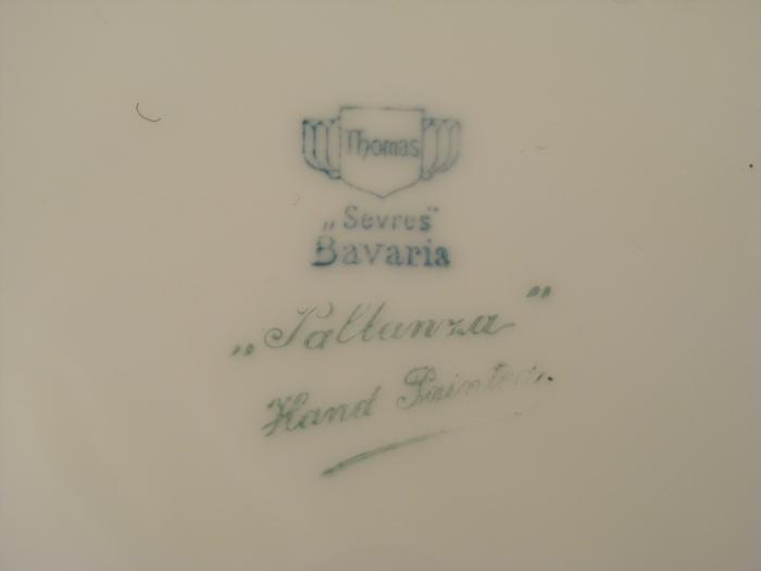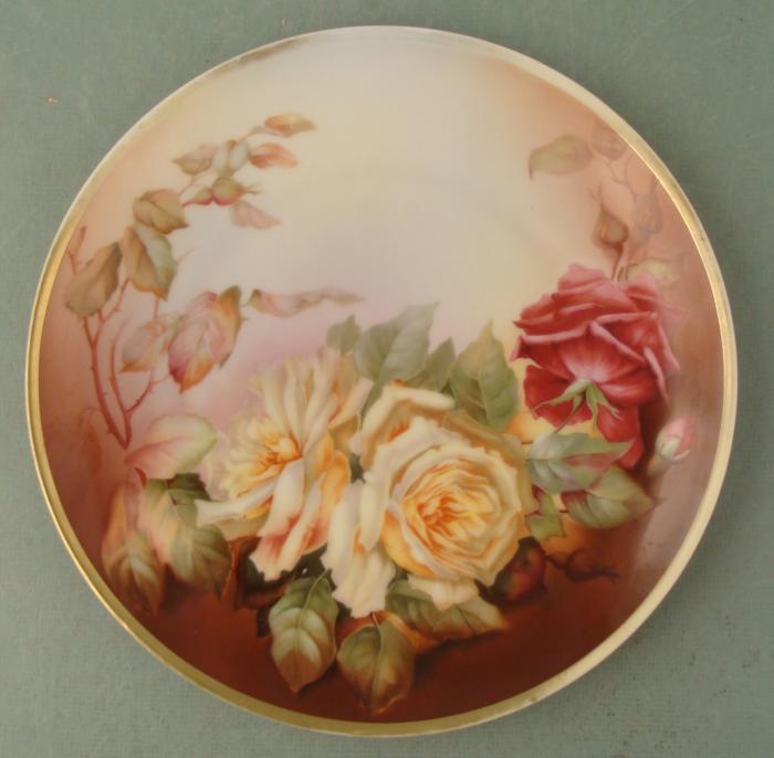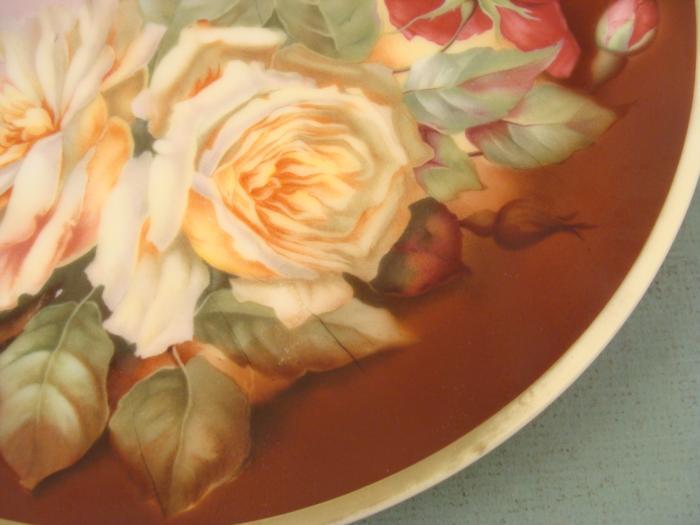 This hand painted Bavaria plate from Thomas is in the "Pallanza" pattern, which features pink and yellow roses on a russet red tone background. It is in excellent condition, with no chips, cracks, or crazing, although it has half of the gold worn off around the rim. It is 10 inches in diameter.