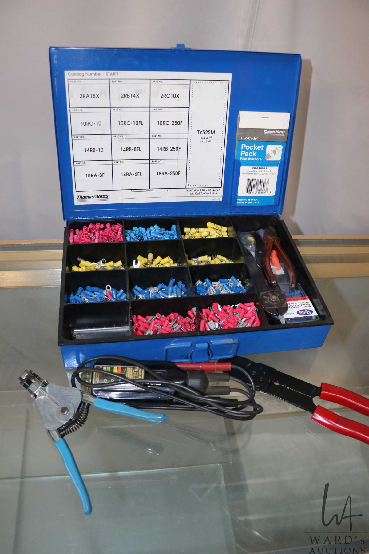 Thomas & Betts electrical terminal kit with wire strippers, assorted pliers and polarity tester