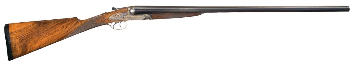 Single bead front sight on the matte solid rib, choked modified and improved modified chokes, 2 3/4 inch chambers, and auto ejectors. Barrel marked "THOMAS BLAND AND SONS" on right. "4&5 WILLIAM IV STREET. STRAND, LONDON. W.C.2." on the left. Blue barrels and trigger guard with casehardened action with simple border engraving and marked "T. BLAND & SONS" on each lock plate. Double triggers, tang safety and mounted with a checkered splinter walnut forearm and English style straight grip stock with tear drop flats, serrated hard rubber butt plate and silver initial oval inlay. 14 3/4 inch pull, drop at the comb is 1-3/8 inches, drop at the heel is 2 1/4 inches.