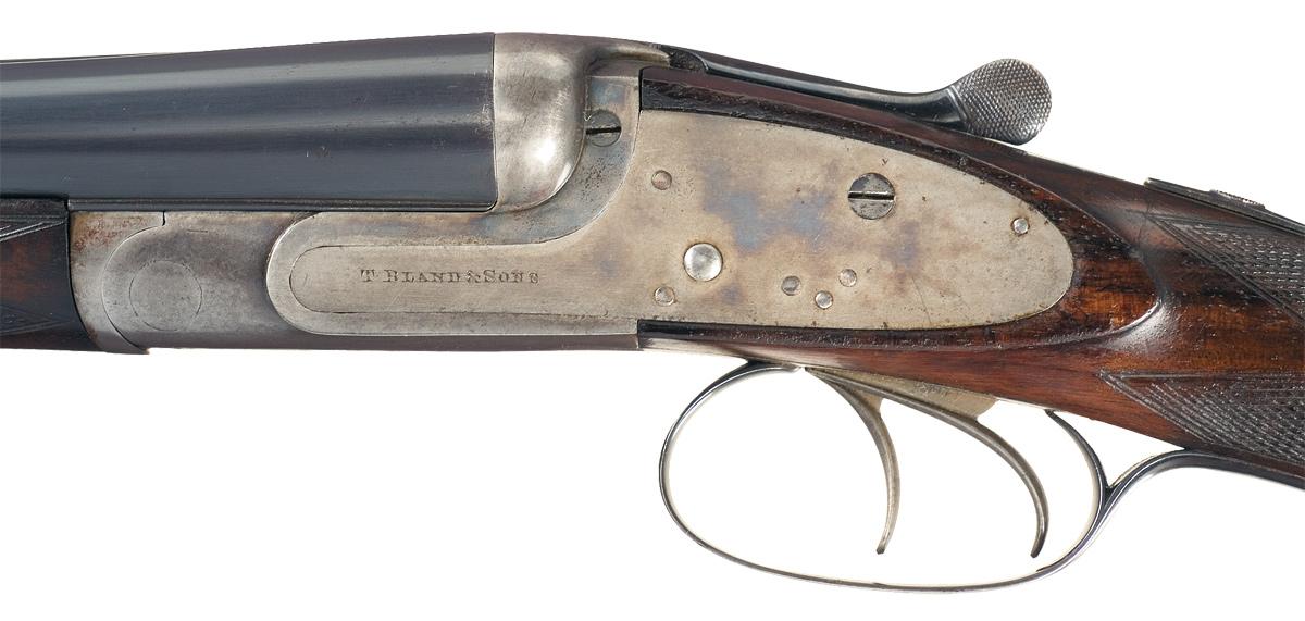Smooth concave rib marked "THOMAS BLAND AND SONS. 2 KING WILLIAM ST. STRAND, LONDON", with brass front bead, choked cylinder and improved cylinder, 2 3/4 inch chambers and extractors. Casehardened action with double triggers, tang safety. Straight grip stock with Schnabel tip forearm, horn insert, silver inscription oval and a serrated horn buttplate. 14 1/8 inch pull.