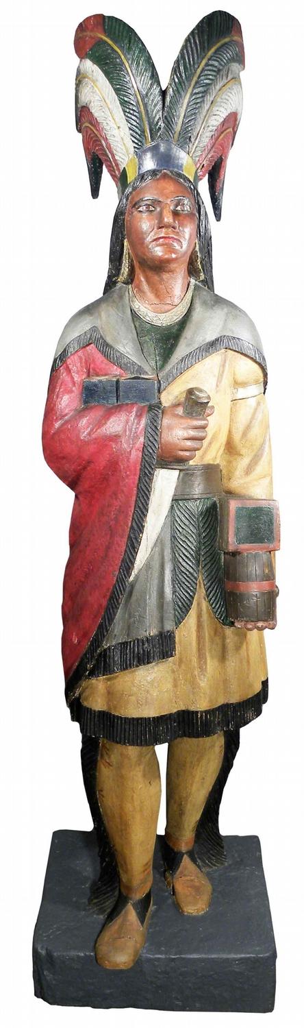 Thomas Brooks (1828 - 1895) Cigar Store Indian Chief Figure. Brooks was one of the most noted wood carvers of figures in the mid to late 1800's. He was mentor to such carvers as Samuel Robb. Working in New York his figures were looked upon as the standard examples of quality art at that time and still today. This is a wonderfully detailed carving. Small separation at the ears and a crack up the back side otherwise very good condition with most of the original paint still intact. 76 inches tall.