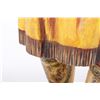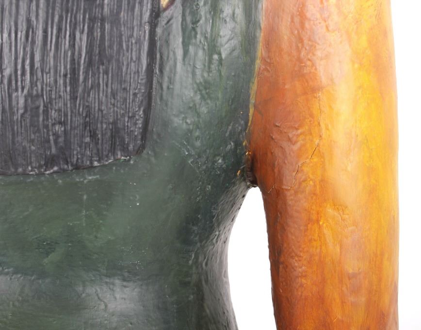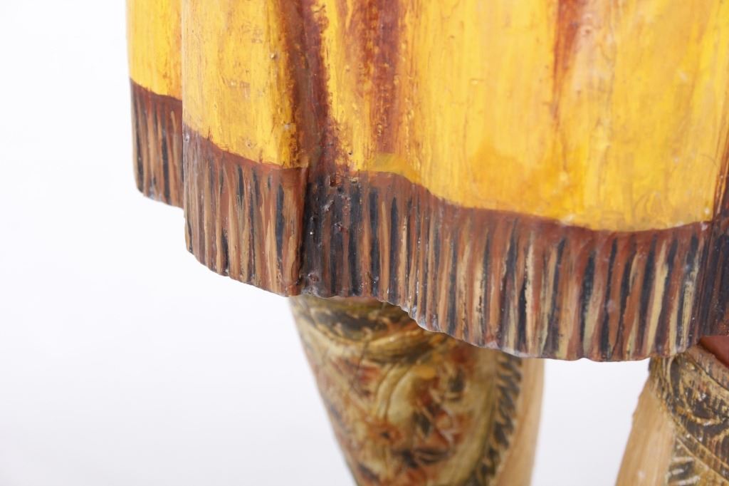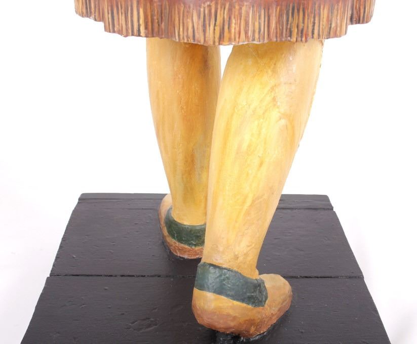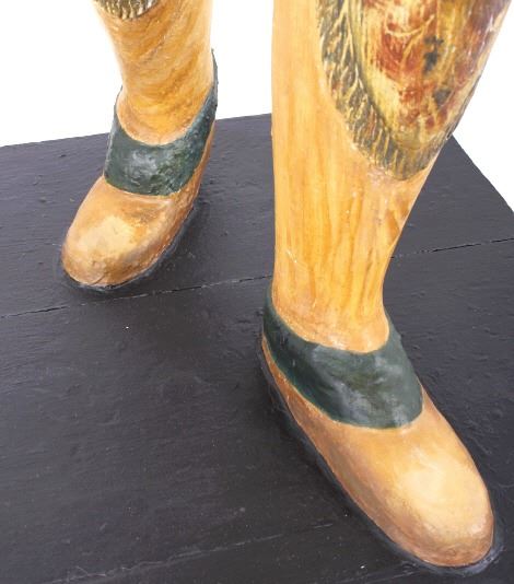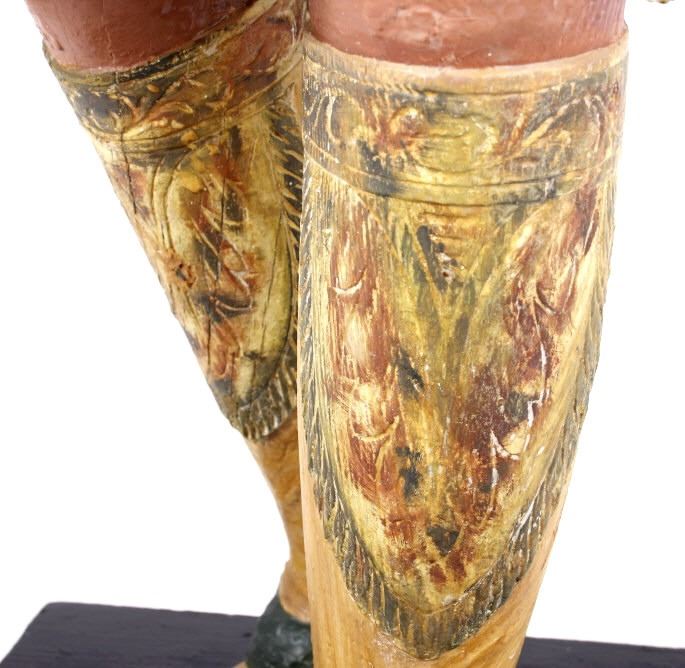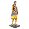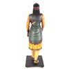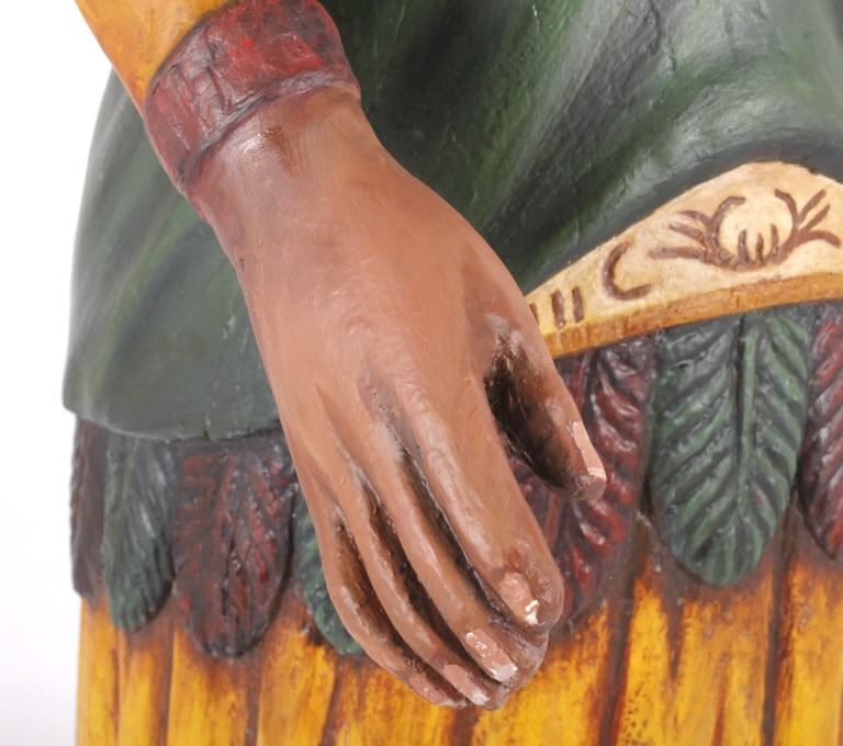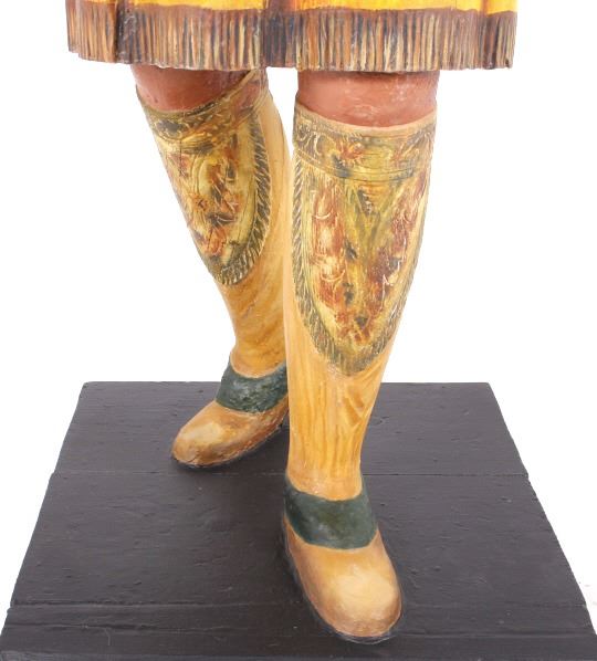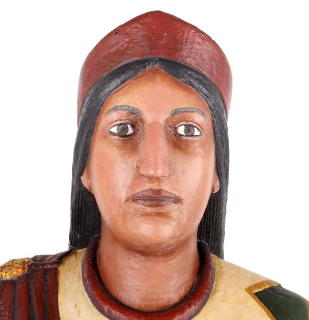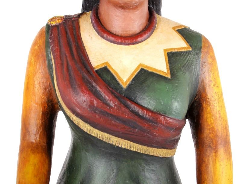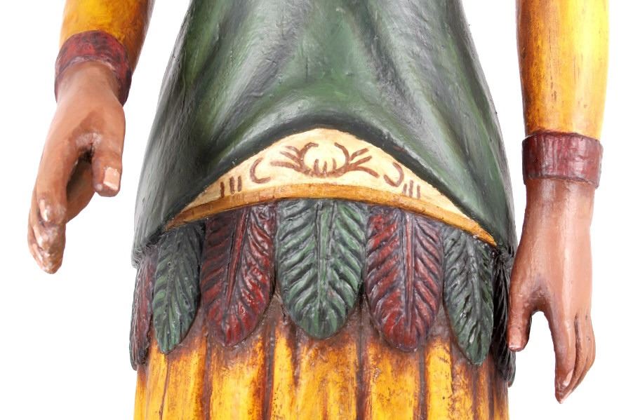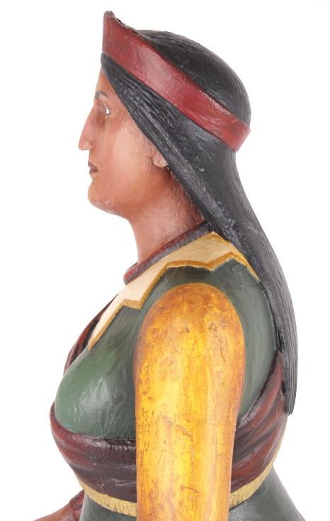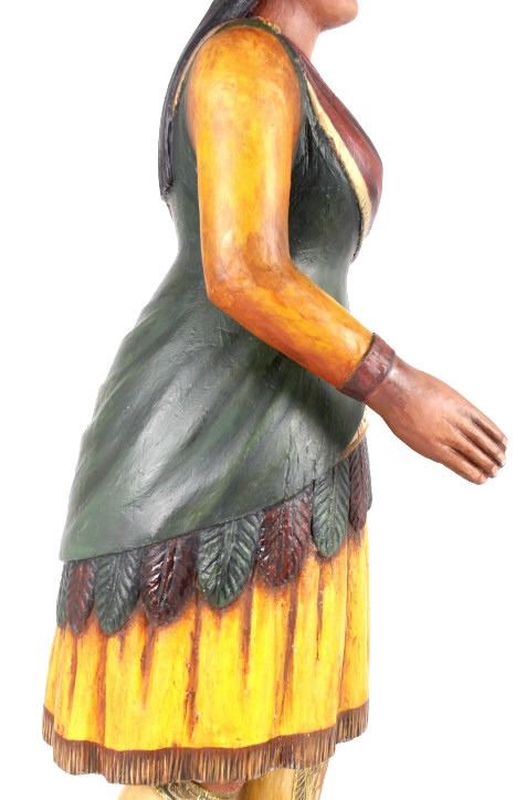 This is a Thomas Brooks carved wooden cigar store Indian maiden from Lead, South Dakota made circa 1880. The Indian figure was purchased from the family of James J. Green, who acquired the piece from a cigar factory he purchased around 1890. Green was a bullion guard at the Homestake Gold Mine and later appointed as Chief of Police in 1897. In 1902, the cigar factory was sold in 1902 at which time Green took the Indian to his residence. The cigar store Indian remained in the family for more than 100 years. The family allowed a local saloon to display the figure in the 1930's. It was repaired and repainted at that time. The cigar store Indian maiden was carved by Thomas Brooks, a well known carver of shop figures from the mid to late 1800's. He opened his shop in New York City in 1848. Due to growing competition and the need for carvers in the wake of the 1871 Chicago fire, Brooks moved to Chicago and opened a new shop. He achieved great success with the expanding Western Frontier. The carved figure shows the Indian maiden in a dress with feather accents, a crown and high top moccasins. The Indian stands on a contemporary base and shows very good condition. The Cigar Store Indian measures 18.5" W x 24" D and is 67.75" tall. A few authentic Thomas Brooks Cigar Store Indian examples such as this have sold at auction including one that sold for $51,750 at Showtime Auction Service in 2011, another that sold for $48.800 at Material Culture Auction in 2013 and one that sold for $36,000 at Rich Penn Auction in 2014.