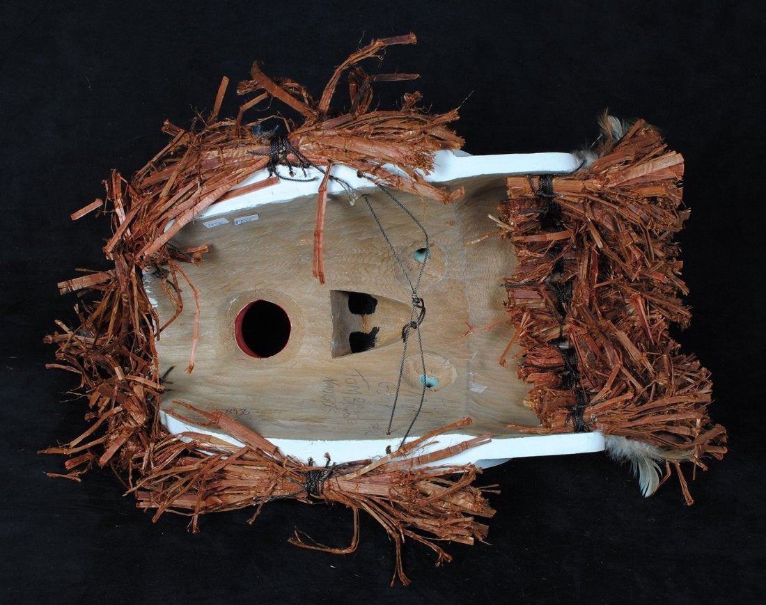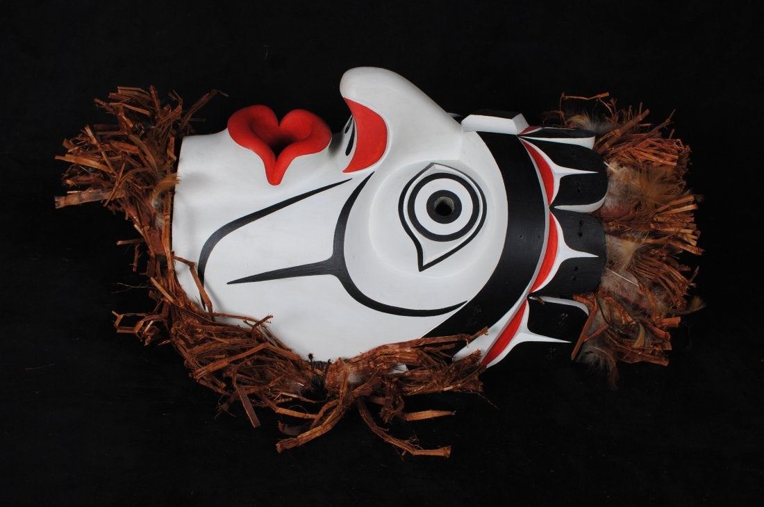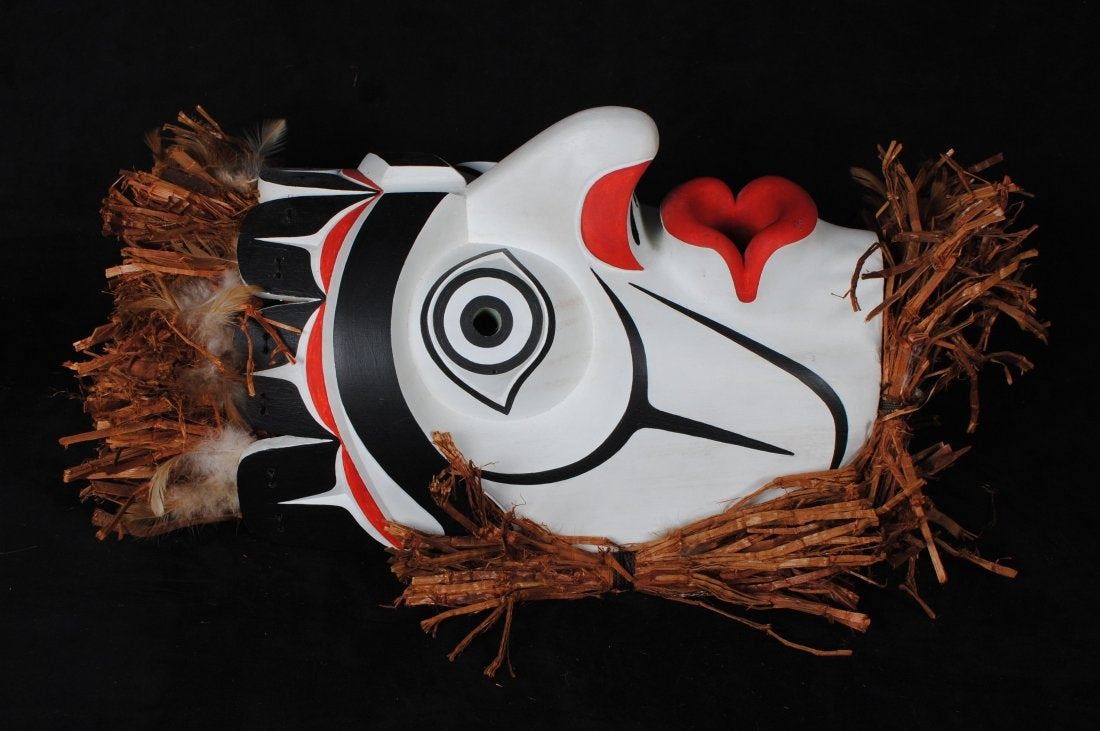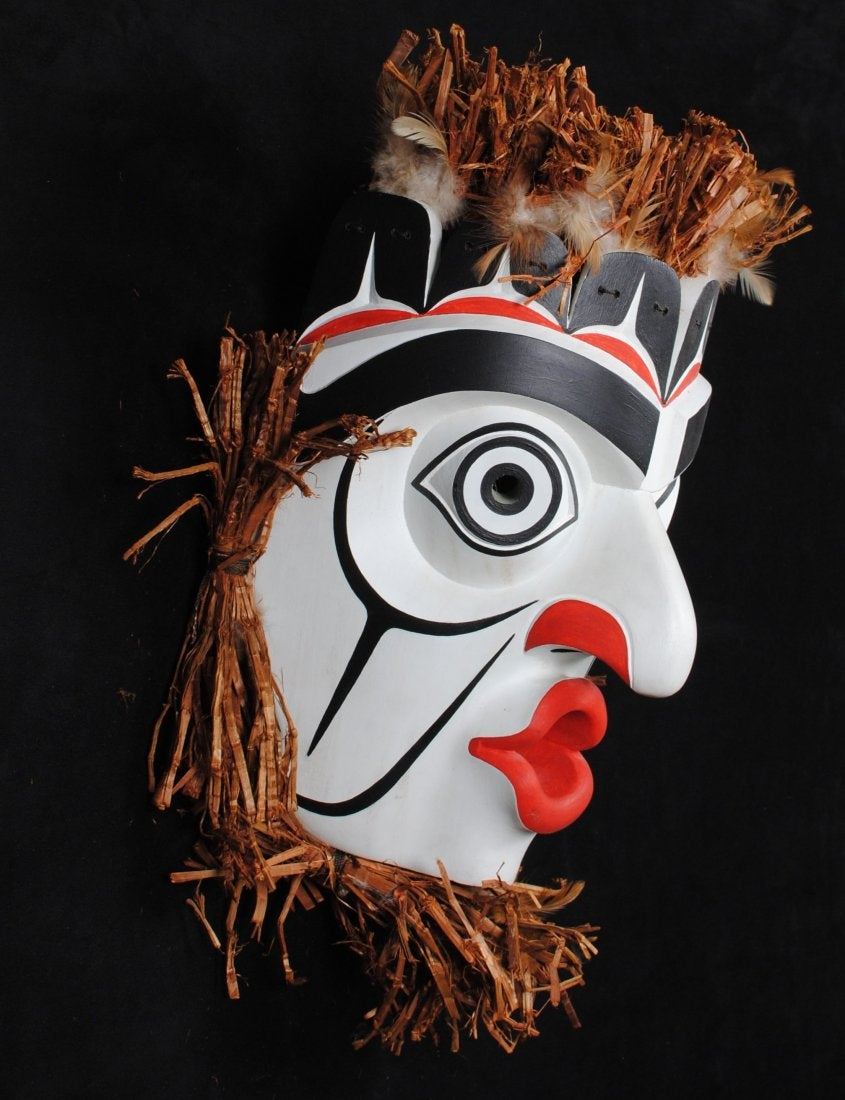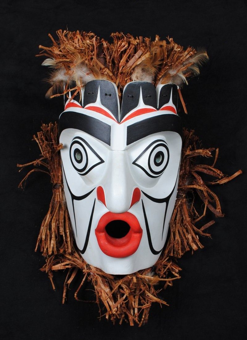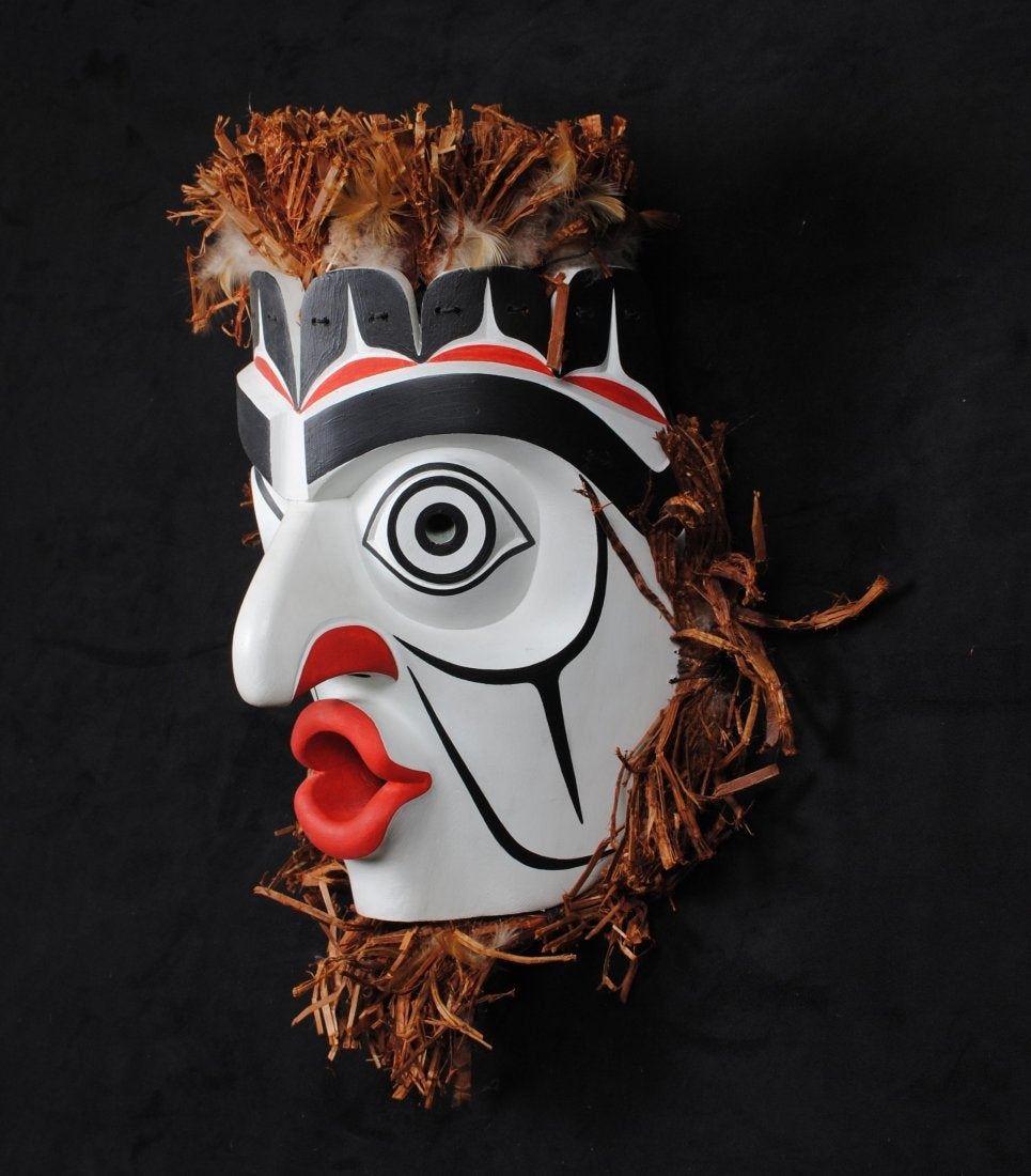 Thomas Bruce's "Mountain Goat Hunter" original wooden carved mask. Carved in 2016, from the community of Kwakwaka'wakw nation, Vancouver Island. This mask is white, black and red, and made of yellow cedar. Was valued between $5,800 - $6,500 in 2016. This mask is in excellent condition. 17 1/2" x 8" x 8 1/2"