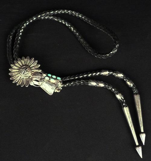 Thomas Byrd Navajo and Sterling Silver leather bolo tie Turquoise and coral cabochons 3" x 1 3/4"