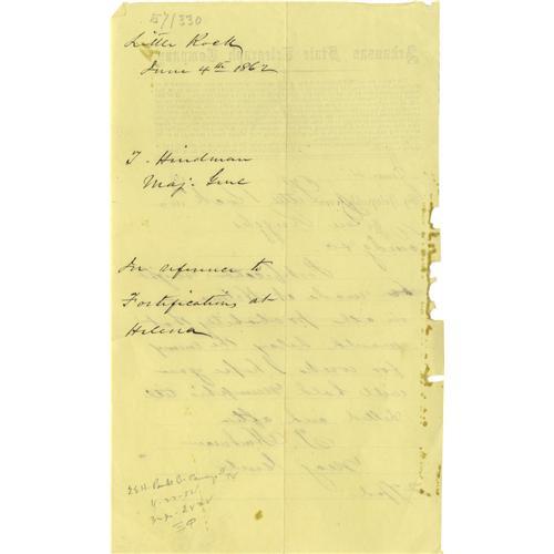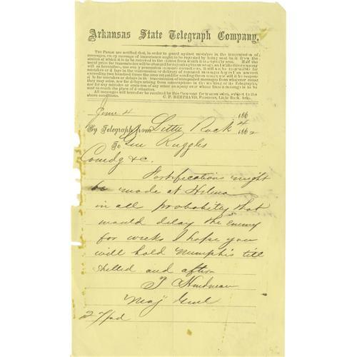 <B>Thomas C. Hindman Autograph Document Signed</B></I> "<I>T. Hindman Maj. Genl.</B></I>" Two pages, 5" x 8.25", Arkansas State Telegraph Company, Little Rock, Arkansas, June 4, 1862. Major General Hindman sent this telegraph to General Ruggles, it reads, "<I>Fortifications might be made at Helena in all probability that would delay the enemy for weeks I hope you will hold Memphis till shelled and after-</B></I>" Hindman was a commander in the Confederate Army and was one of the leading voices for Arkansas' succession; he was a member of the infamous "Fire Eaters" who more or less fueled the conflagration which would be the Civil War. He was assassinated in 1868. <BR><BR>The document is in very fine condition; slight tears and holes present on left edge. From the Henry E. Luhrs Collection. Accompanied by LOA from PSA/DNA.