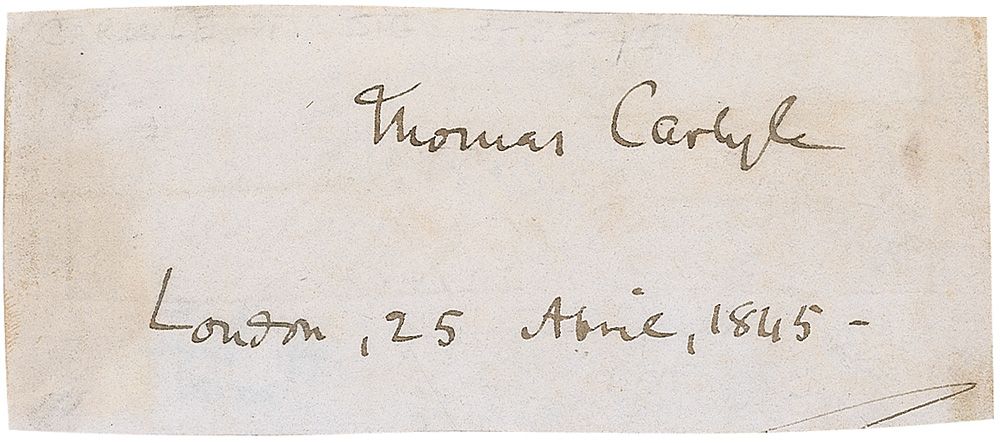 Influential Scottish-born Victorian philosopher, essayist, and historian (1795–1881). Ink signature, “Thomas Carlyle, London, 25 April, 1845,” on an off-white 4 x 1.75 slip. In very good condition, with central vertical fold through a single letter of signature, scattered toning, and mounting remnants to reverse.