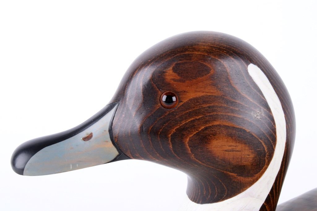 For your consideration, a carved wooden pintail drake decoy. The decoy was hand carved and painted by Bozeman artist, Thomas Chandler. The bottom of the decoy has been signed by the artist and reads, "Thomas Chandler/ Pintail Drake/ 1991". In addition to works Chandler produced from his own studio, he was also a Master Carver for Big Sky Carvers in Bozeman prior to the company's move to Manhattan, Montana. The carved wooden pintail drake decoy is in very good condition. It measures 6" wide and is 20" long.