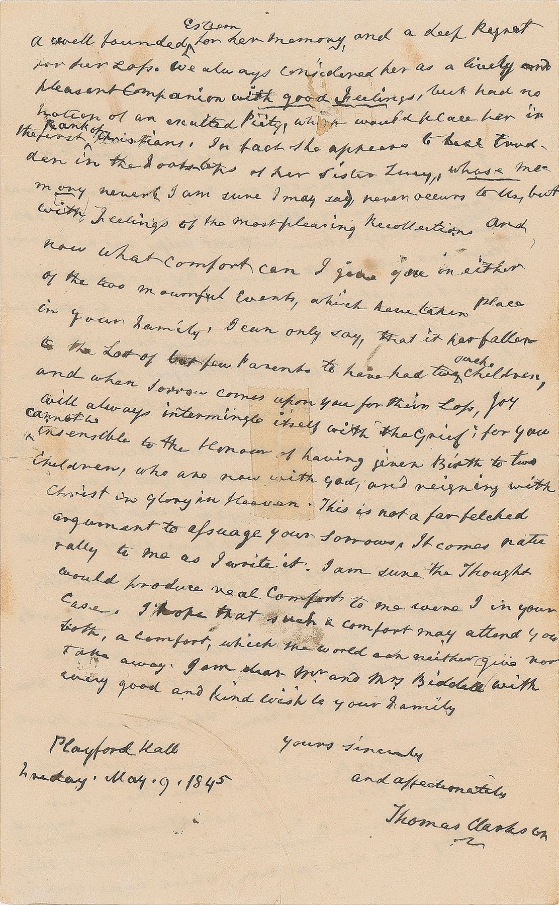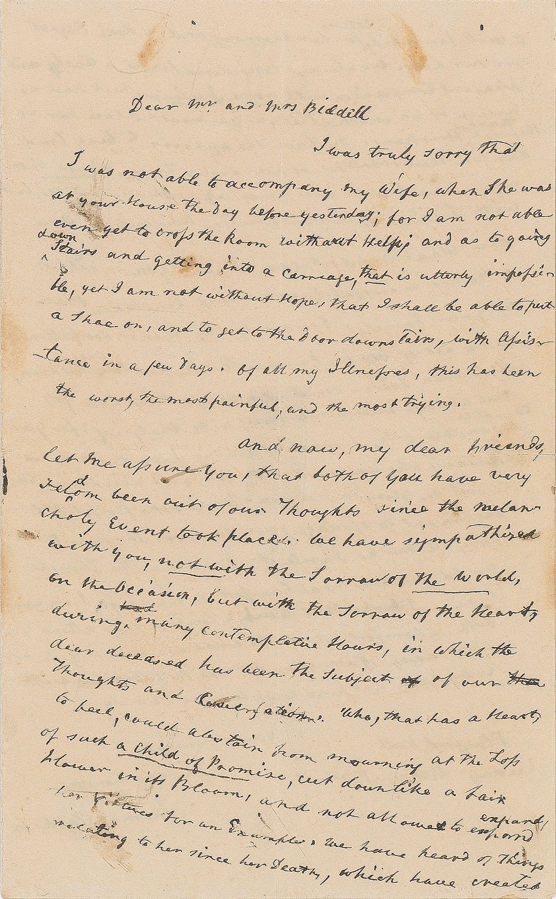 English abolitionist (1760–1846) who was a leading campaigner against the slave trade in the British Empire. ALS, one page both sides, 4.5 x 7.25, May 9, 1845. Letter to Mr. and Mrs. Biddell, in part: "I am not able even get to cross the room without help; and as to going downstairs and getting into a carriage, that is utterly impossible, yet I am without hope, that I shall be able to put a shoe on, and to get to the door downstairs, with assistance in a few days. Of all my illnesses, this has been the worst, the most painful, and the most trying…You have very seldom been out of our thoughts since the melancholy event took place. We have sympathized with you…Who, that has a heart to feel, could abstain from mourning at the loss of such a child of promise, cut down like a fair flower in its bloom." In fine condition, with scattered light staining, and an old piece of clear tape to the center of the signed page.