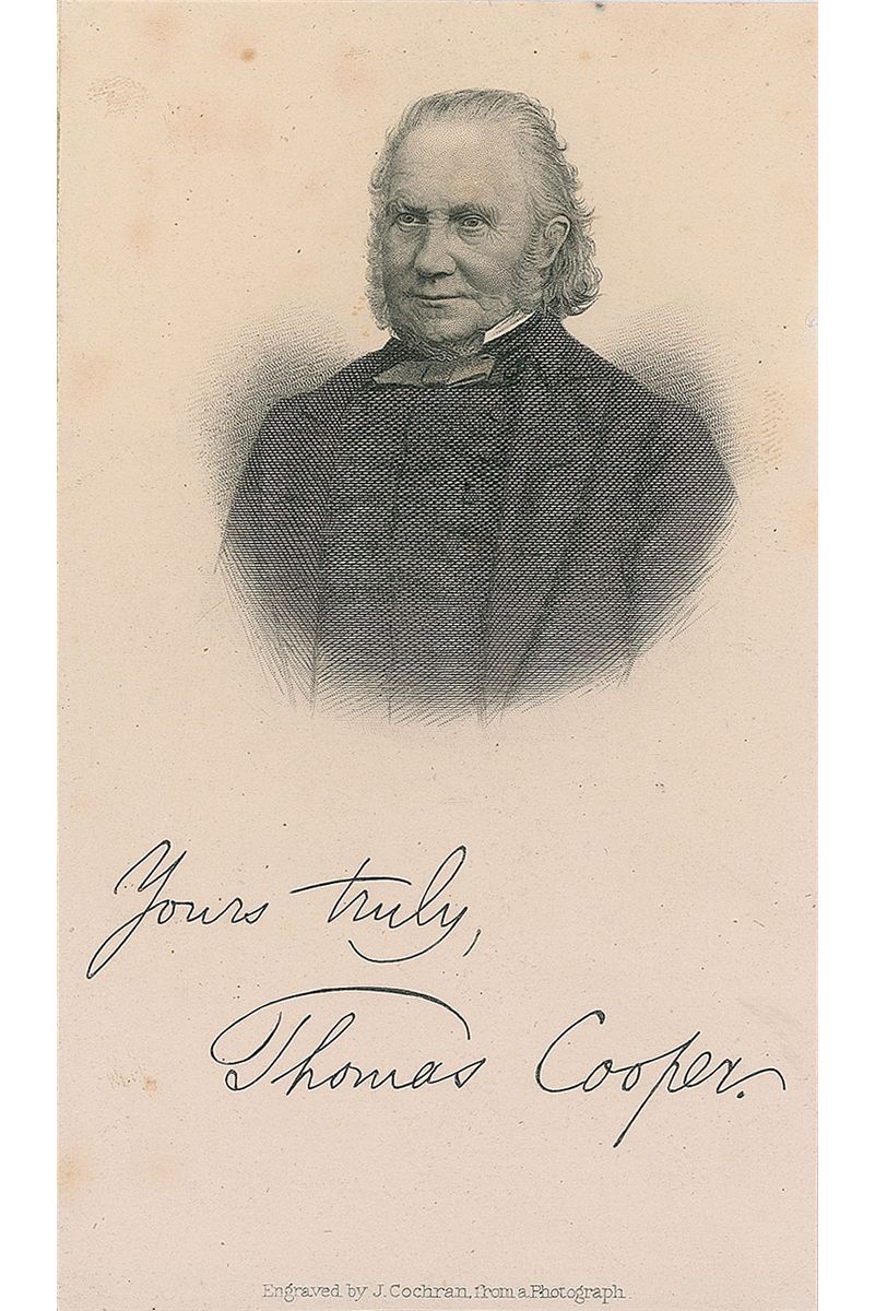 AQS, one page on an off-white 6 x 6 sheet, dated Worcester, October 21, 1879. Cooper pens the final stanza of his poem entitled ‘Chartist Song,’ in full: “The time shall come when earth shall be / A garden of joy, from sea to sea; / When the slaughterous sword is drawn no more, / And Mercy exults, from shore to shore. / Toil, brothers, toil, till the work is done, / Till slaughter is ended, and the / World’s peace is won!” Light scattered toning and soiling, otherwise fine condition. Accompanied by an unsigned contemporary engraved portrait of Cooper.