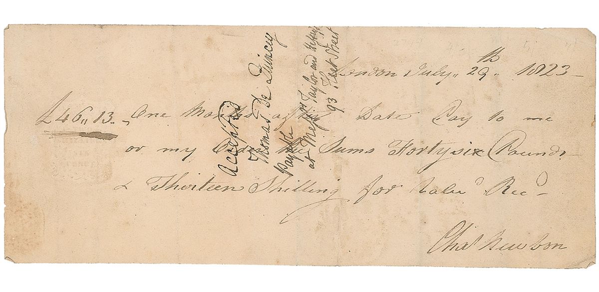 British author (1785–1859) best remembered for his now-classic memoir of his experiments with drugs, Confessions of an English Opium-Eater. Endorsement written vertically over a promissory note, one page, 9 x 3.5, London, July 29, 1823. Over a promissory note for £46.13, De Quincey writes, “Accepted, Thomas De Quincey, Payable at Mess’rs Taylor and Hessey, 93 Fleet Street.” In very good condition, with multiple vertical folds and light scattered toning and soiling. Signed one year after publishing Confessions of an English Opium-Eater in book form, this document presents an especially interesting association, as the address De Quincey gives is that of his publisher.