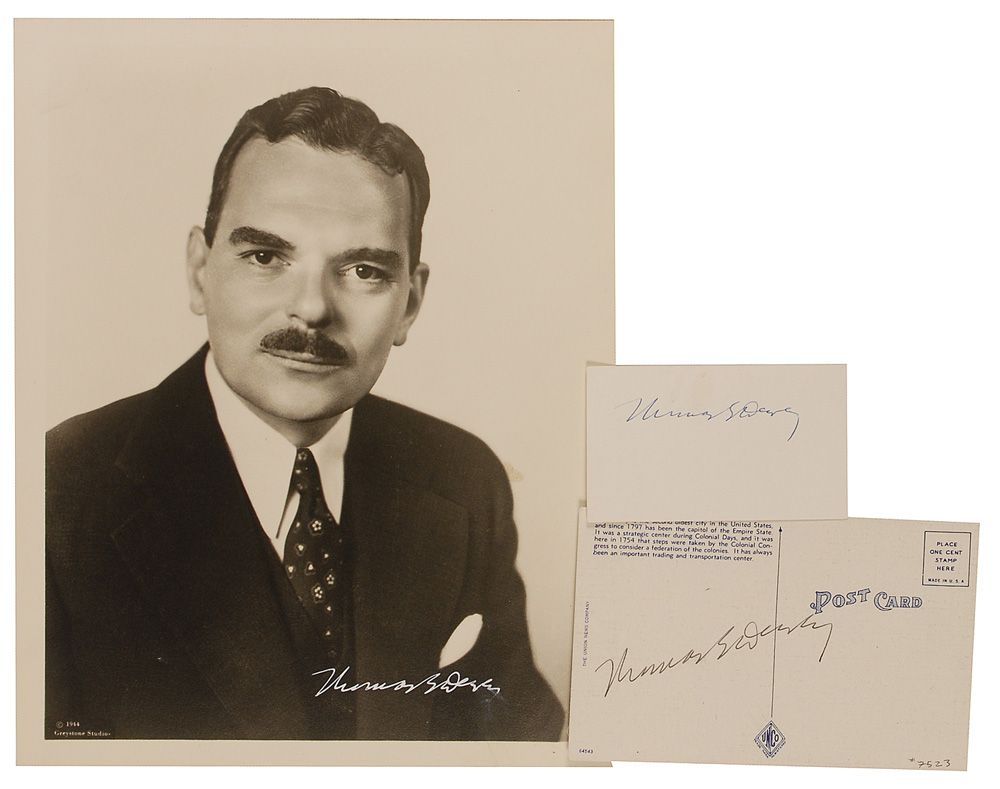 Three items: one vintage matte-finish 8 x 10 portrait of Dewey, signed in white ink; one postcard of the governor’s mansion in Albany, signed on the reverse in fountain pen; one fountain pen signature on a 3.5 x 2 off-white card. In overall fine condition, with some mild scattered soiling and light rippling to the right edge of the photo. Accompanied by four typed letters from his secretary.