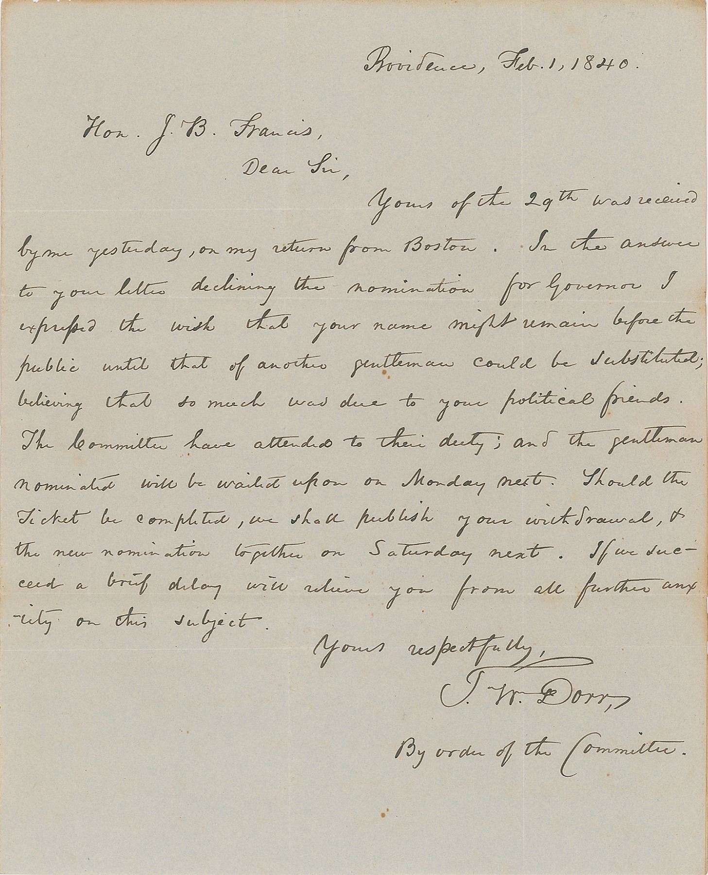ALS signed “T. W. Dorr,” one page, 8 x 10, February 1, 1840. Written from Providence, a letter to former governor John Brown Francis, in full: "Yours of the 29th was received by me yesterday, on my return from Boston. In the answer to your letter declining the invitation for Governor I expressed the wish that your name might remain before the public until that of another gentleman could be substituted; believing that so much was due to your political friends. The Committee have attended to their duty; and the gentleman nominated will be waited upon on Monday next. Should the Ticket be completed, we shall publish your withdrawal, & the new nomination together on Saturday next. If we succeed a brief delay will relieve you from all further anxiety on this subject." In fine condition.
