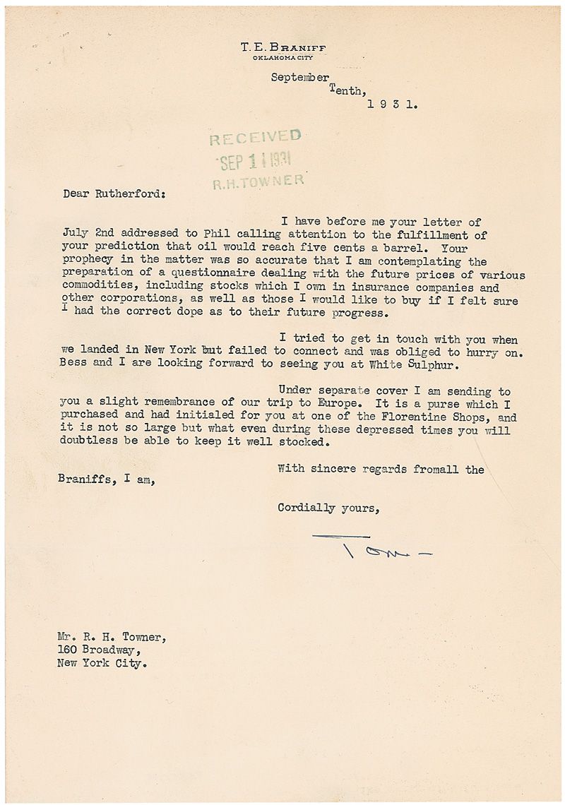 American financier (1883–1954) who founded Braniff Airways and who was killed in the crash of a private plane. TLS signed “Tom,” one page, 7 x 10, personal letterhead, September 10, 1931. Braniff writes to Rutherford Towner. In part: “I have before me your letter of July 2nd addressed to Phil calling attention to the fulfillment of your prediction that oil would reach five cents a barrel. Your prophecy in the matter was so accurate that I am contemplating the preparation of a questionnaire dealing with the future prices of various commodities, including stocks which I own in insurance companies and other corporations, as well as those I would like to buy if I felt sure I had the correct dope as to their future progress…. Under separate cover I am sending to you a slight remembrance of our trip to Europe. It is a purse which I purchased and had initialed for you at one of the Florentine Shops, and it is not so large but what even during these depressed times you will doubtless be able to keep it well stocked.” Light mailing fold through signature, and a few staple holes and subtle hint of toning to top margin, otherwise fine condition.