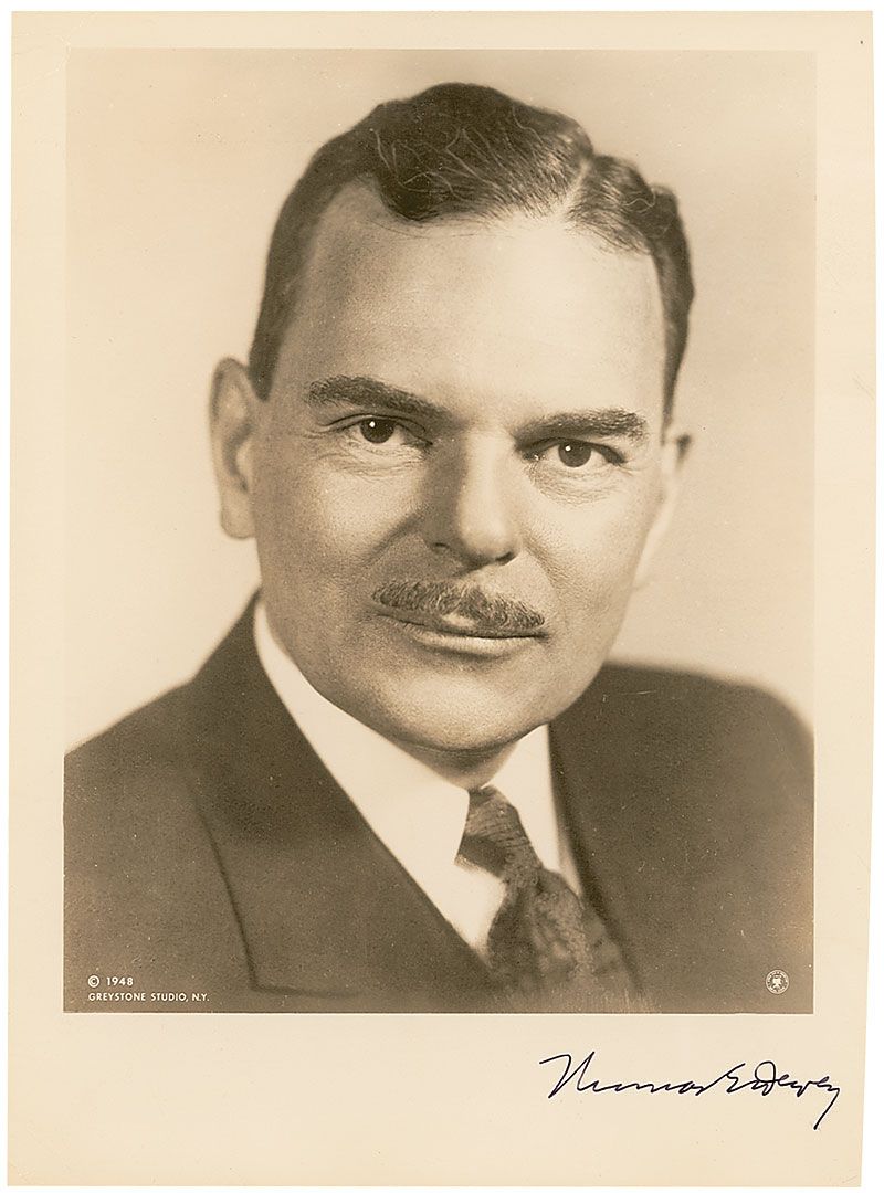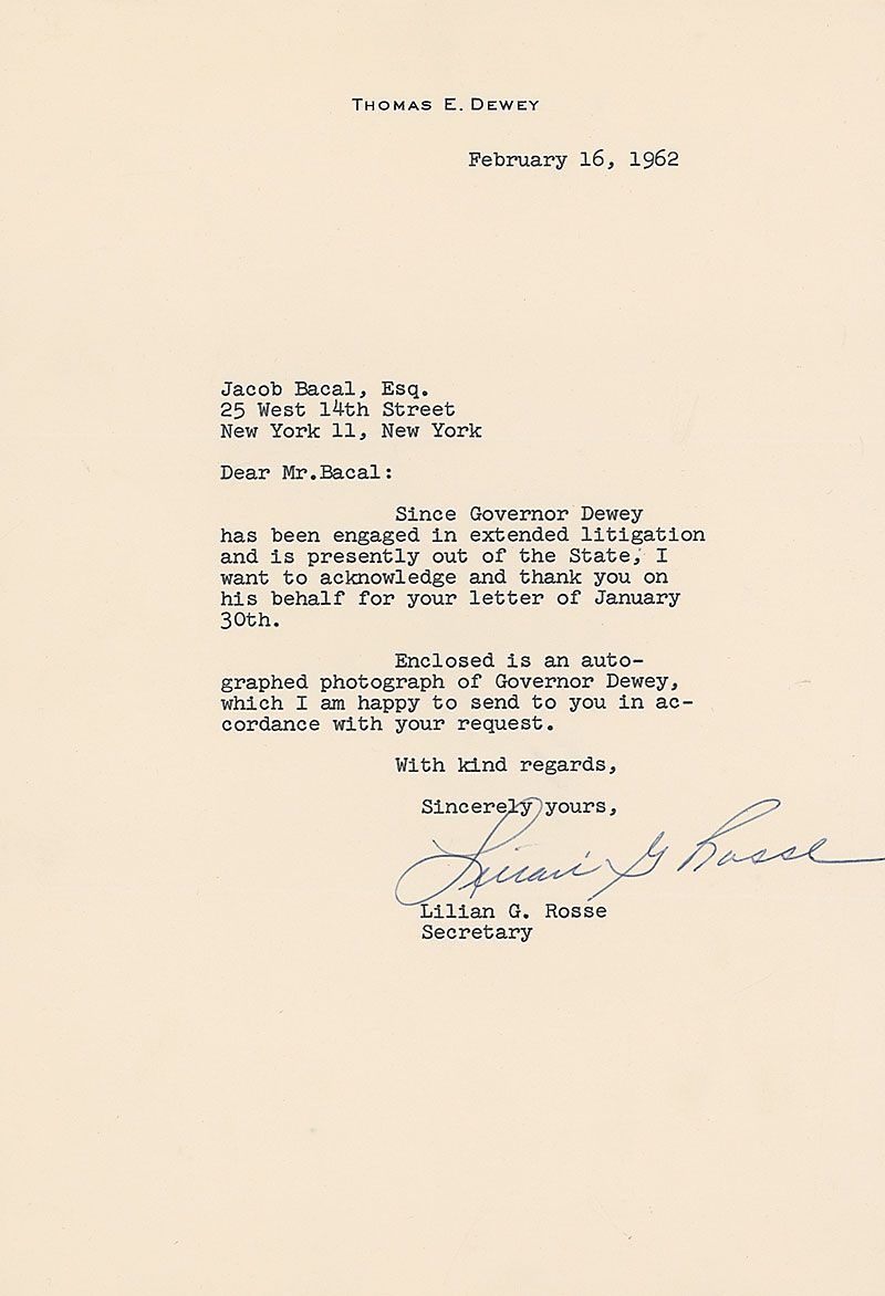 Matte-finish 7.25 x 10 portrait of Dewey, signed in the lower border in fountain pen. In very good to fine condition, with scattered creases and trimmed edges. Accompanied by a letter from his secretary transmitting the photo, dated February 16, 1962.